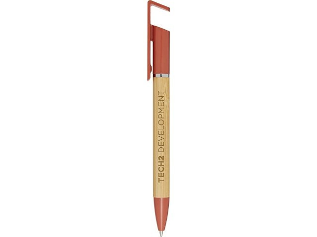 Бамбуковая шариковая ручка, которая также может служить подставкой для телефона. Кнопка и среднее кольцо изготовлены из переработанного пластика, наконечник — из латуни, а корпус — из бамбука, полученного из ответственных источников. Цвет чернил: черный. Длина непрерывной линии: 1000 метров. Размер пера: 1,0 мм. FSC certified bamboo. FSC Mix Credit N5 CU-COC-877277.