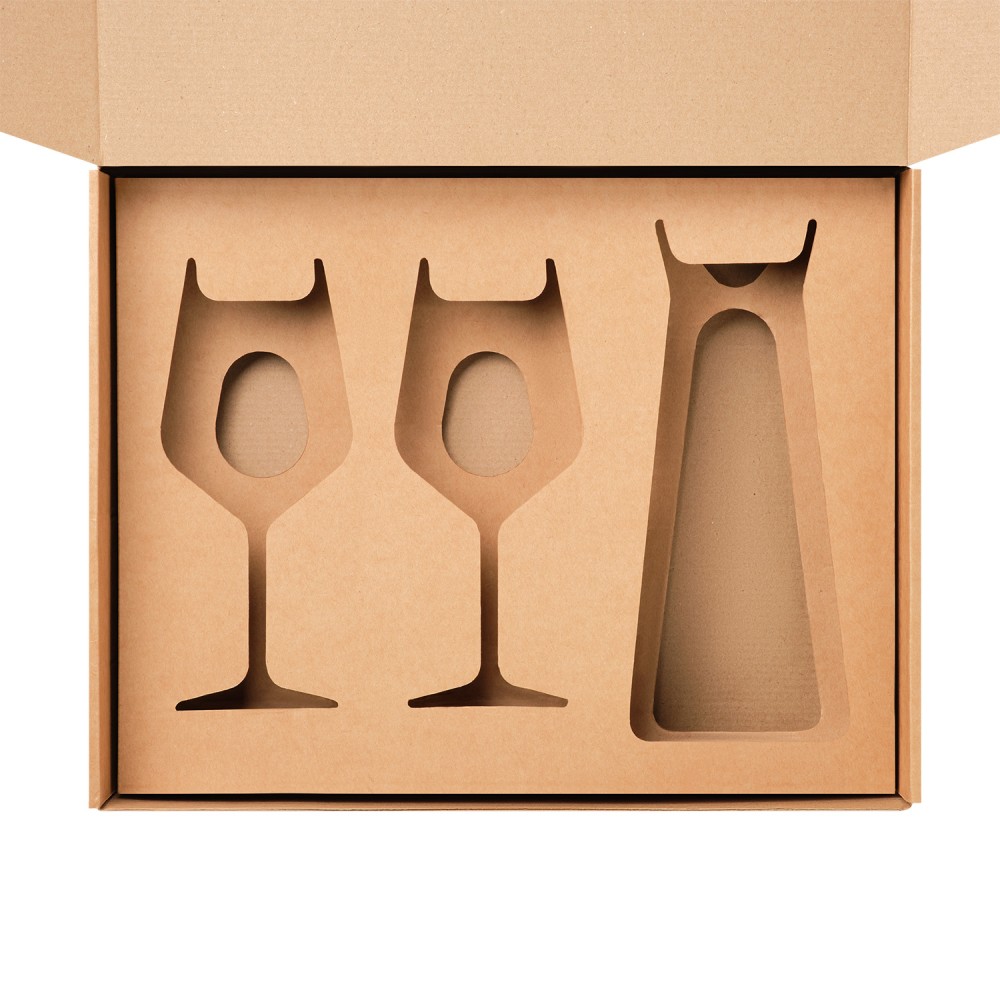 Виртуальный набор – полный комплект из ДВУХ ложементов под декантер + 2 бокала в большую универсальную коробку, крафт (арт. 21005.020)Внимание! Полный ложемент состоит из ДВУХ частей – ВЕРХНЕЙ и НИЖНЕЙ. Таким образом товары более плотно лежат и удерживаются в коробке.
