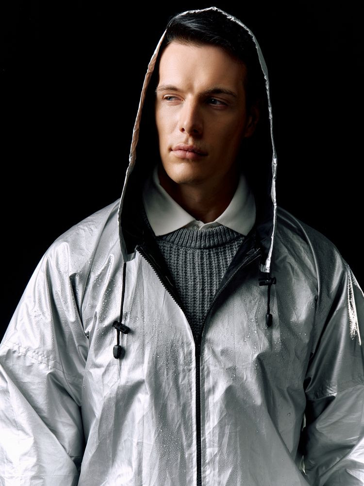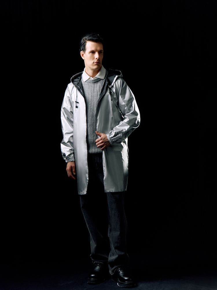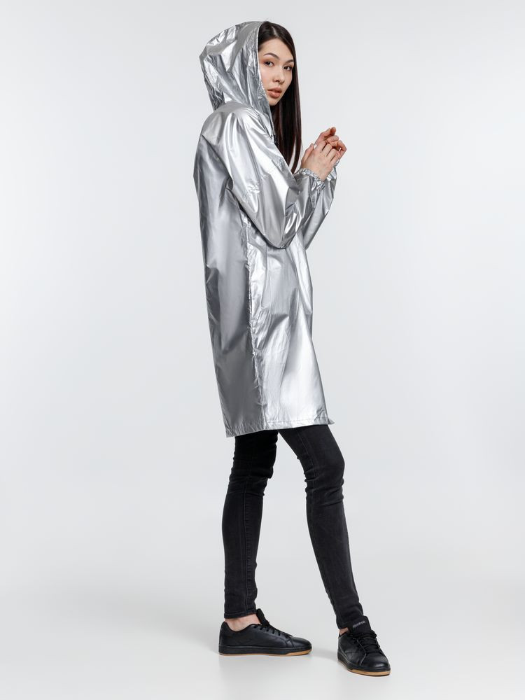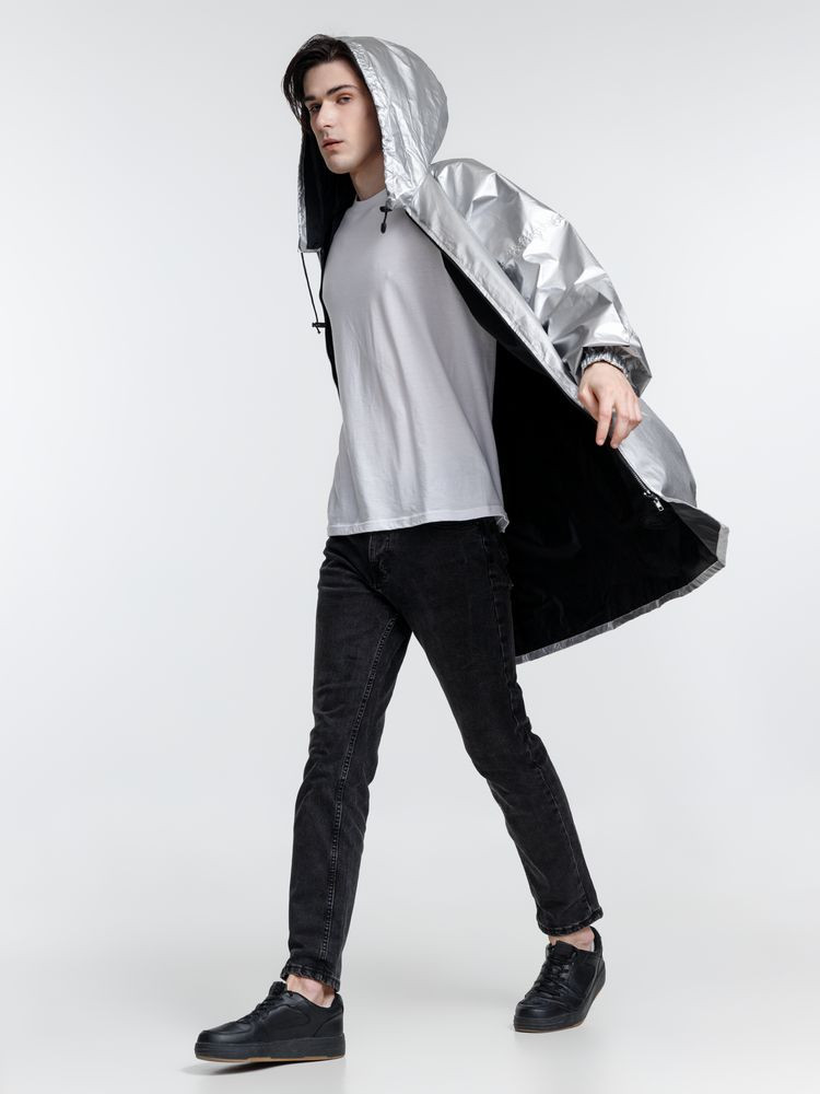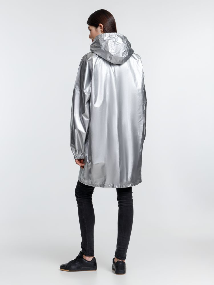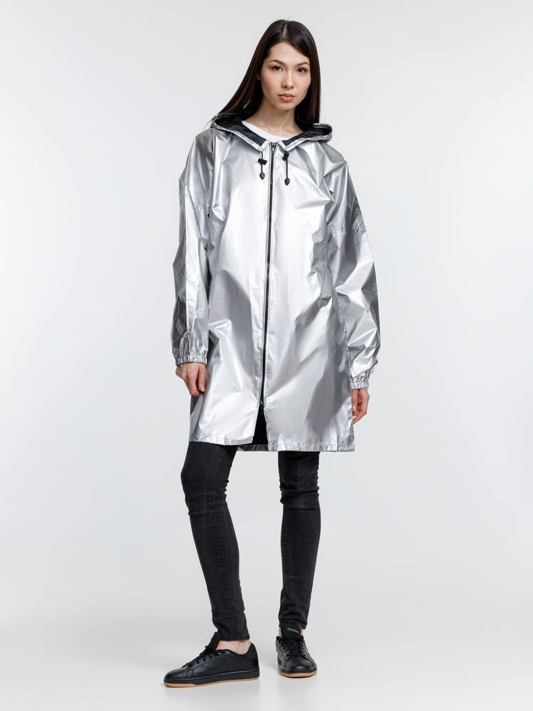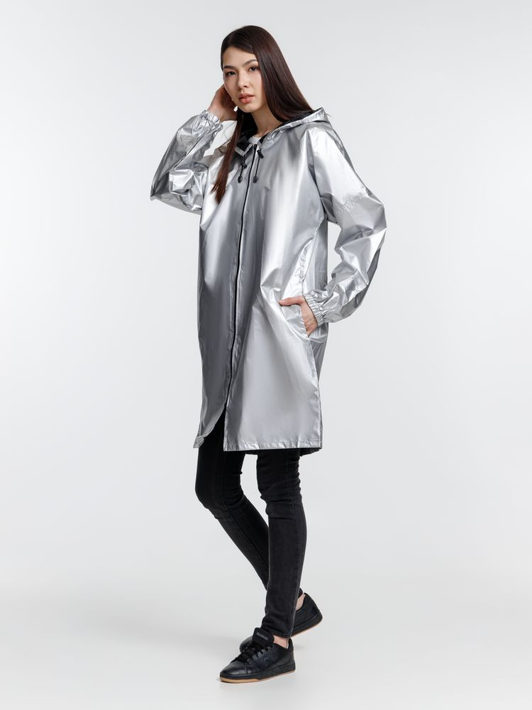 Плащ-дождевик из ткани таффета на молнии с капюшоном. Складывается в мешочек — удобно брать с собой.