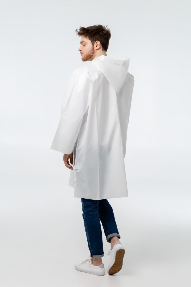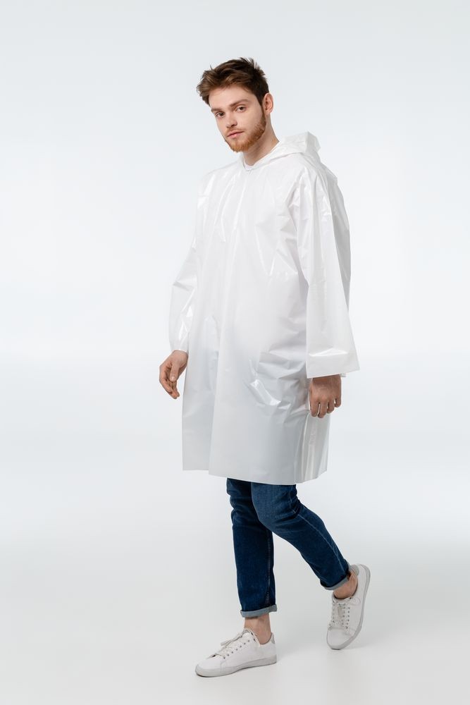 Дождевик-плащ с капюшоном и длинным рукавом из плотного полиэтилена высокого давления (ПВД).