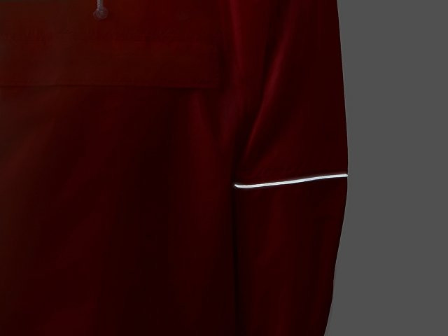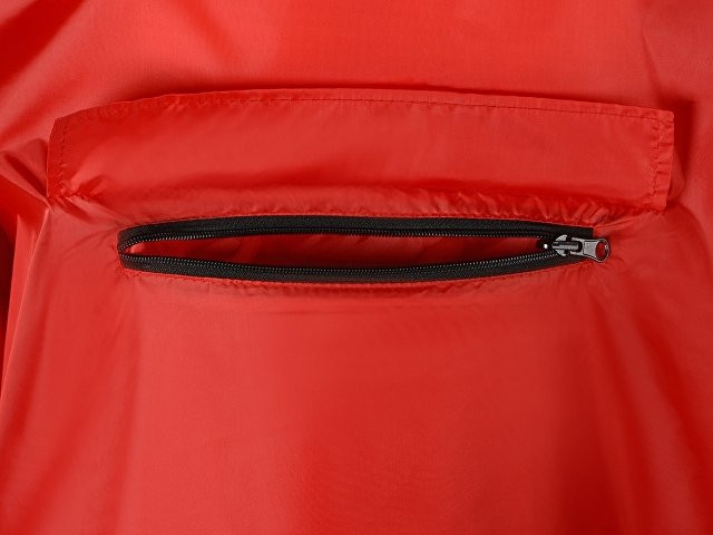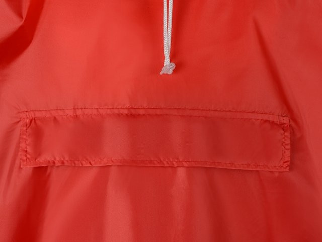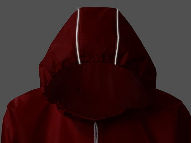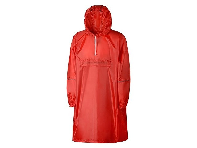 Дождевик - пончо прямого силуэта. Нагрудный карман плаща закрывается на молнию, которая дополнительно защищена клапаном, а еще в него можно полностью убрать дождевик. На дне кармана — ручка-петелька, которая в сложенном виде может использоваться для подвешивания. Швы капюшона и рукавов отделаны светоотражающим кантом, который делает человека заметным даже в темное время суток. Для комфортной посадки — затягивающийся на шнурок капюшон с фиксатором и манжеты на резинке.