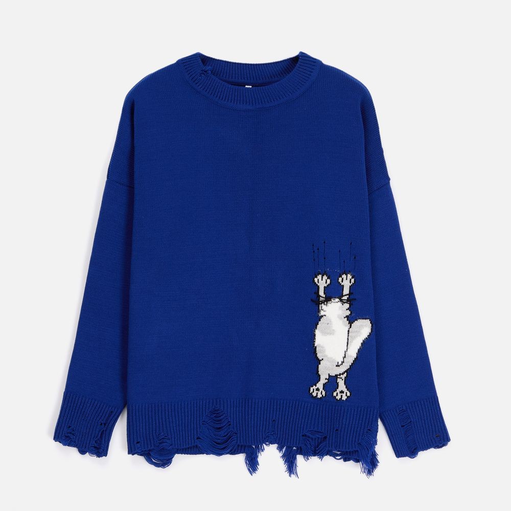 В дизайне мягкого джемпера с круглым вырезом Sharpick гранж-эстетика органично сочетается с милым акцентом — пушистым рисунком в виде озорного котика. Получается веселая вариация на тему того, откуда берется модная рваная одежда, а джемпер моментально создает настроение легкой несерьезности. Рваные края изделия добавляют современную нотку, а резинка на вороте, манжетах и по низу обеспечивает удобную посадку.