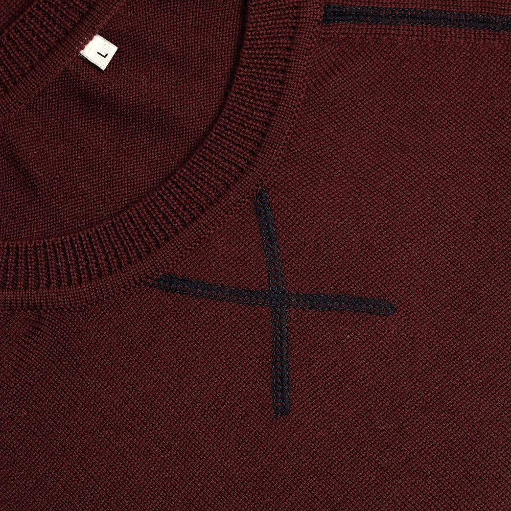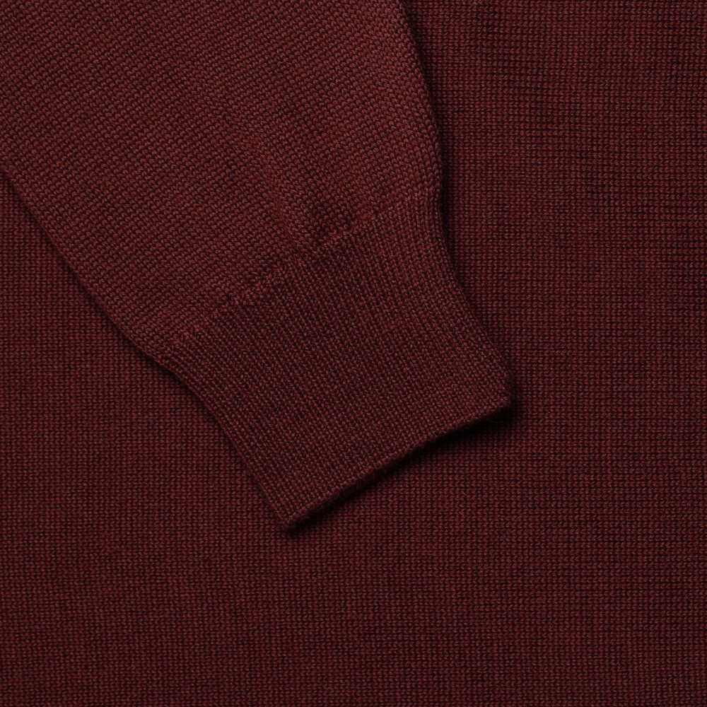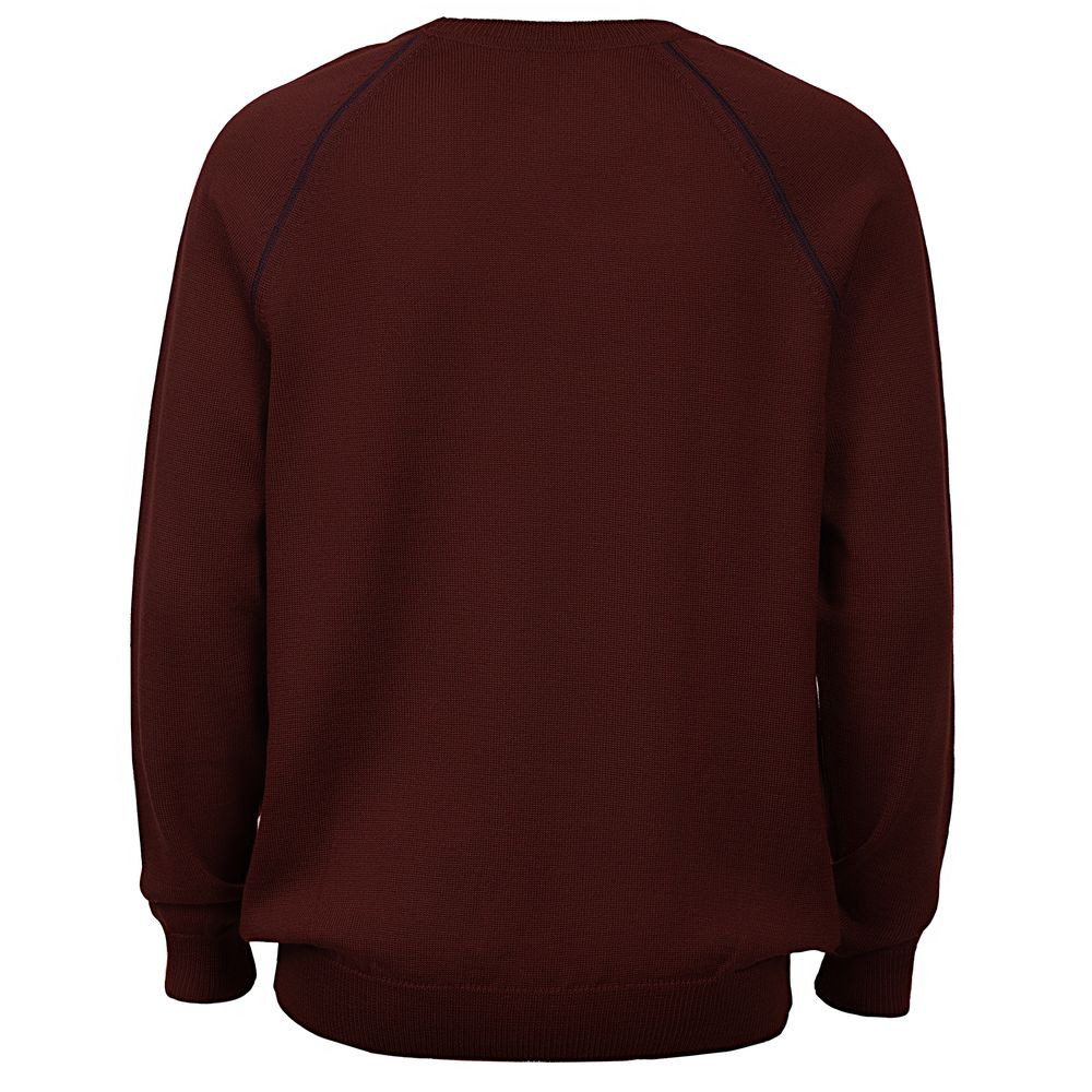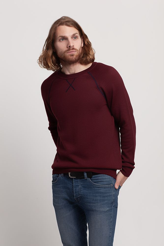 Джемпер чулочной вязки с круглым воротом и контрастной строчкой.