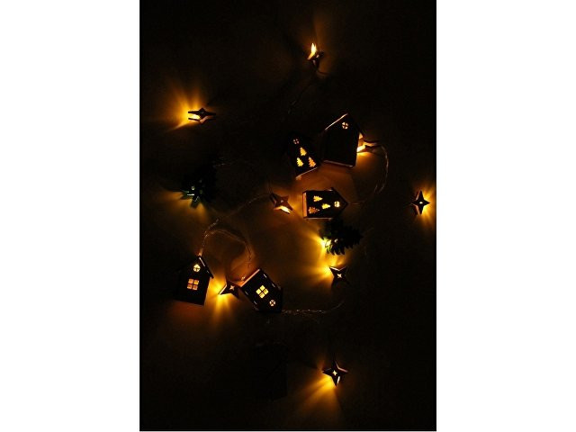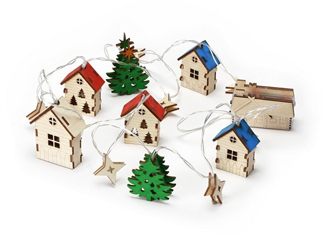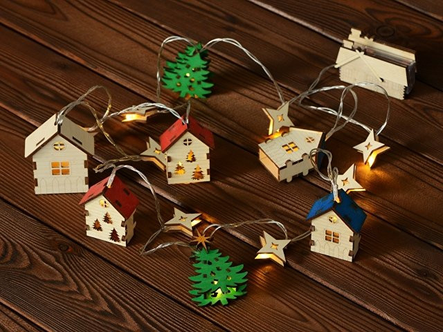 Расчет нанесенияСветодиодная новогодняя елочная гирлянда постоянного свечения с цветными фигурками из натуральной березовой фанеры. Работает от 2-х батареек АА (в комплекте).