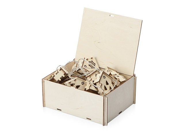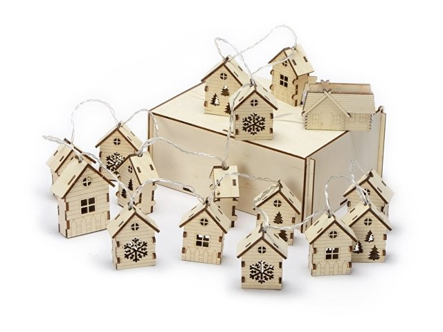 Светодиодная новогодняя елочная гирлянда постоянного свечения с домиками из натуральной березовой фанеры. Работает от 2-х батареек АА (в комплекте). Упакована в деревянную подарочную коробку со стружкой.
