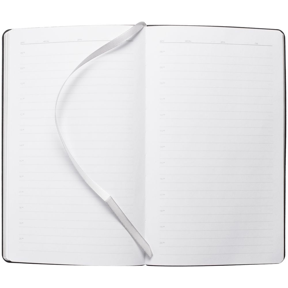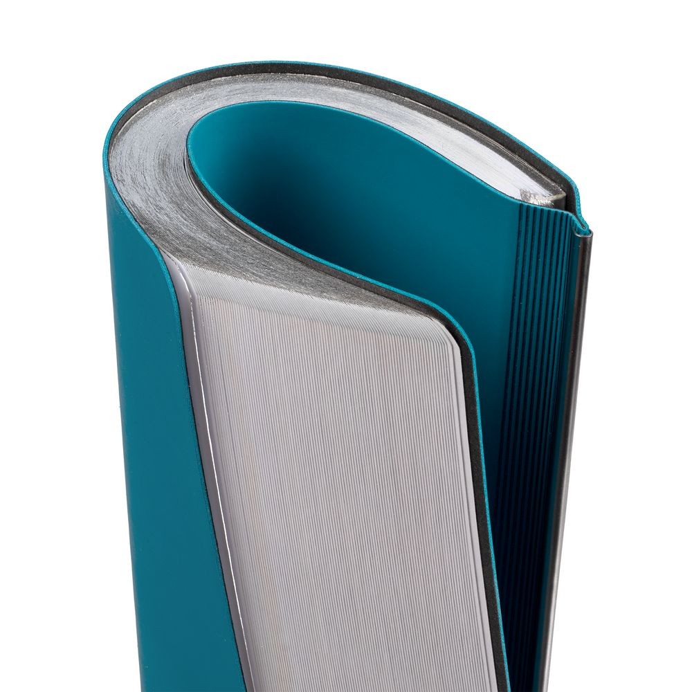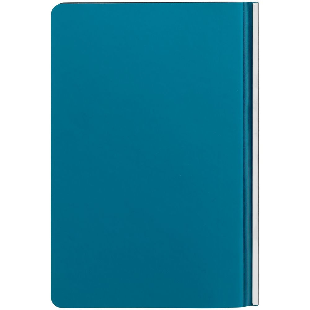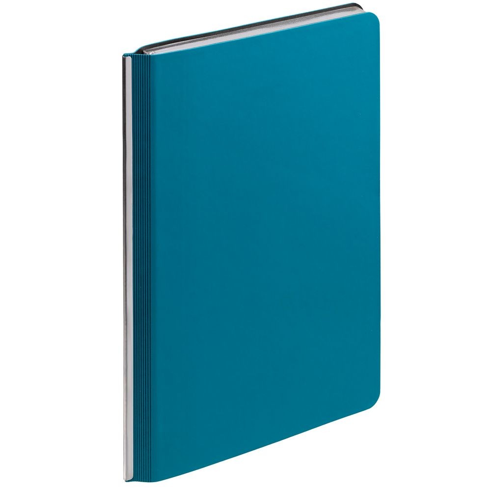 Ежедневник с гибкой обложкой и металлическим корешком, выполнен из материала Soft Touch, цвета морской волны II, дополнен серебристым обрезом блока и ляссе.
