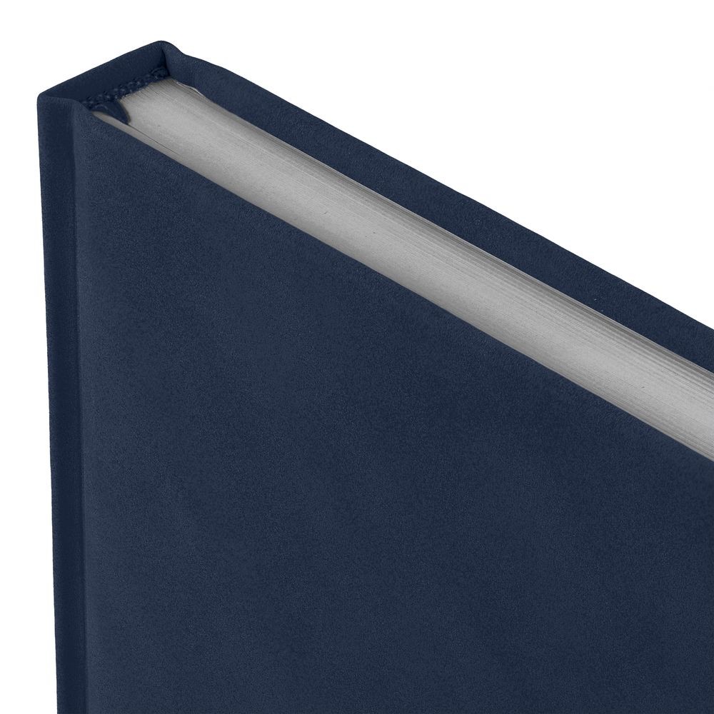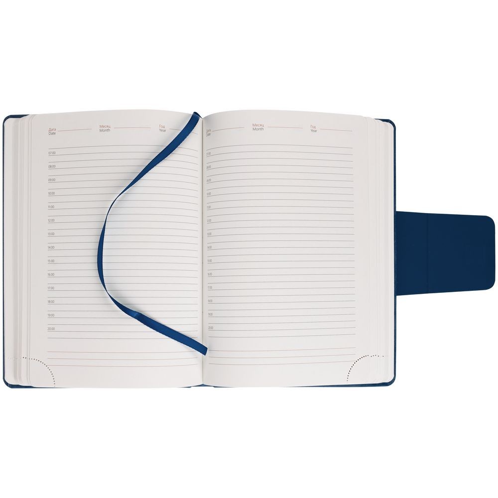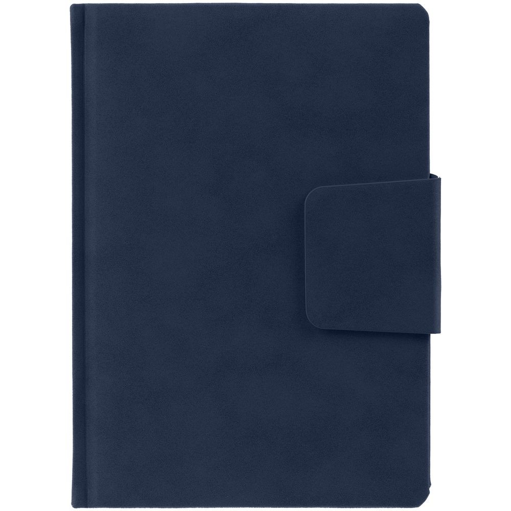 Ежедневник с твердой обложкой c поролоном, выполнен из материала Nubuck, темно-синий ХХ, дополнен капталом и ляссе темно-синего цвета. Застежка — хлястик на магните.