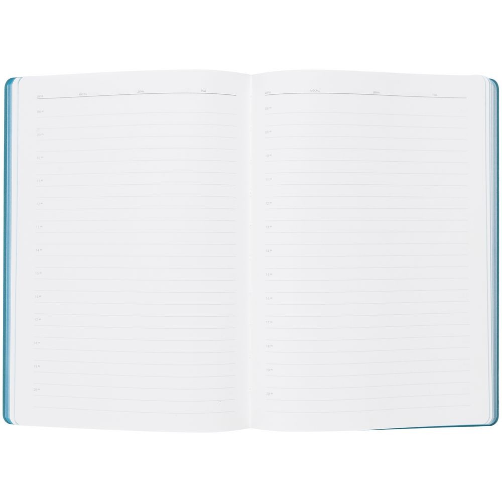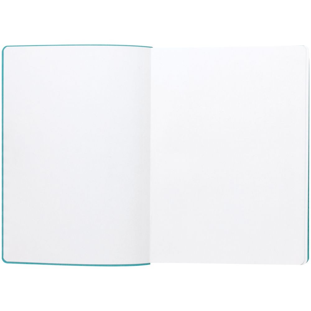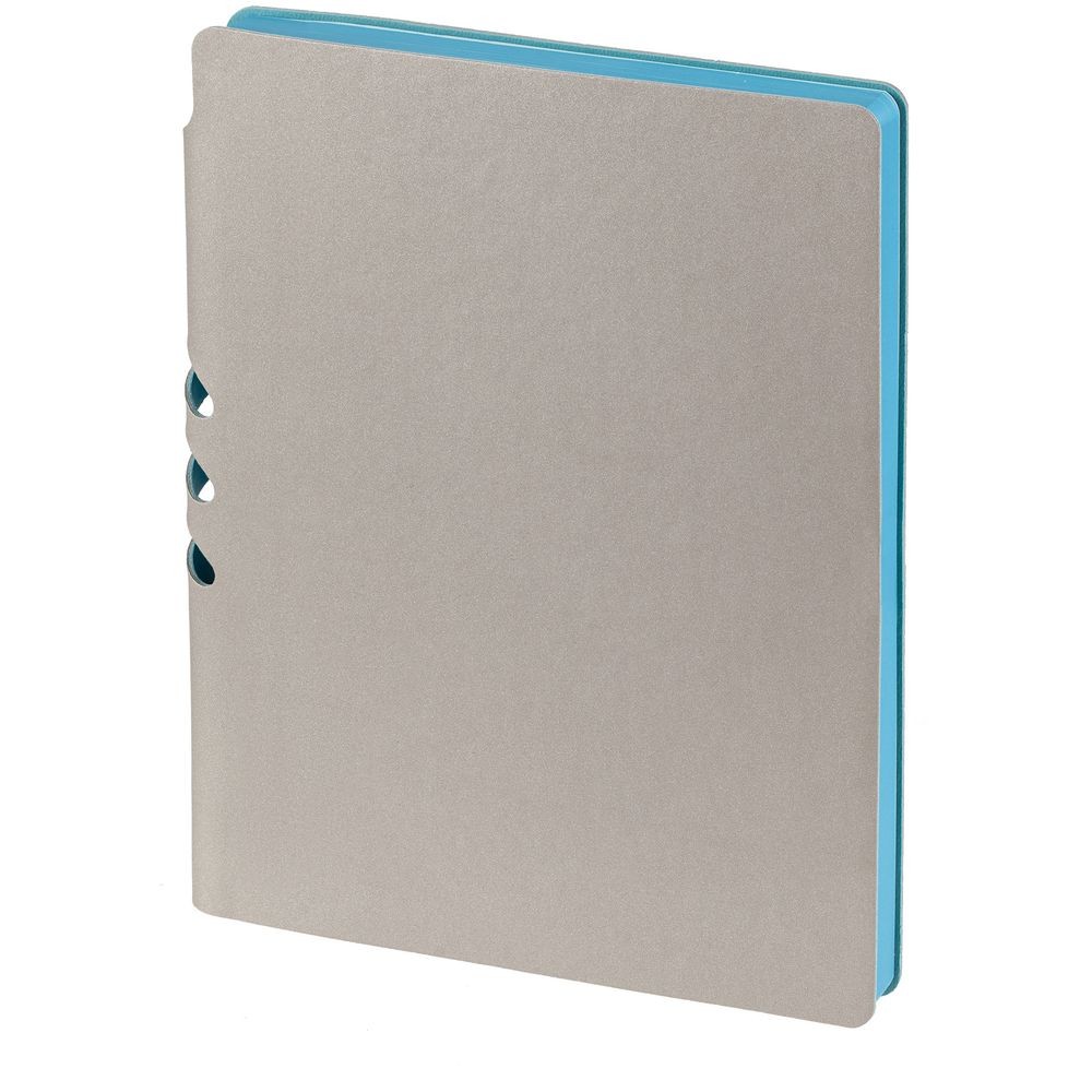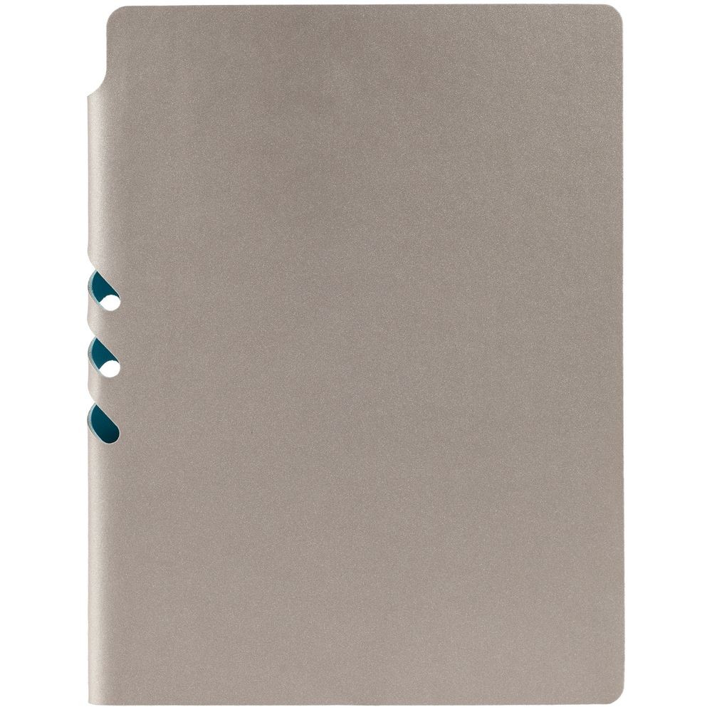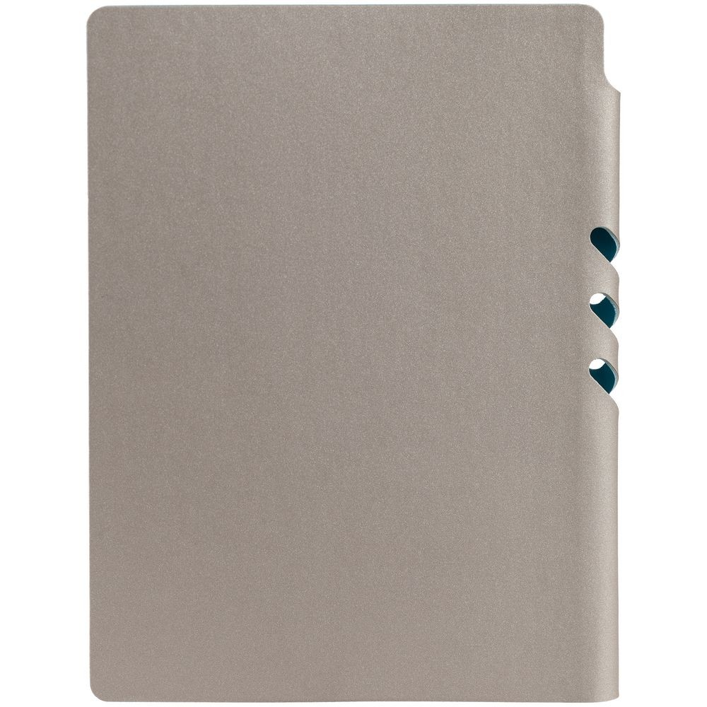 Гибкая обложка выполнена из материала Velour Melange, серый СС и Latte, бирюзовый II (внутренняя часть обложки). Внутри корешка — специальное место для крепления ручки размером до 15х0,9 см.