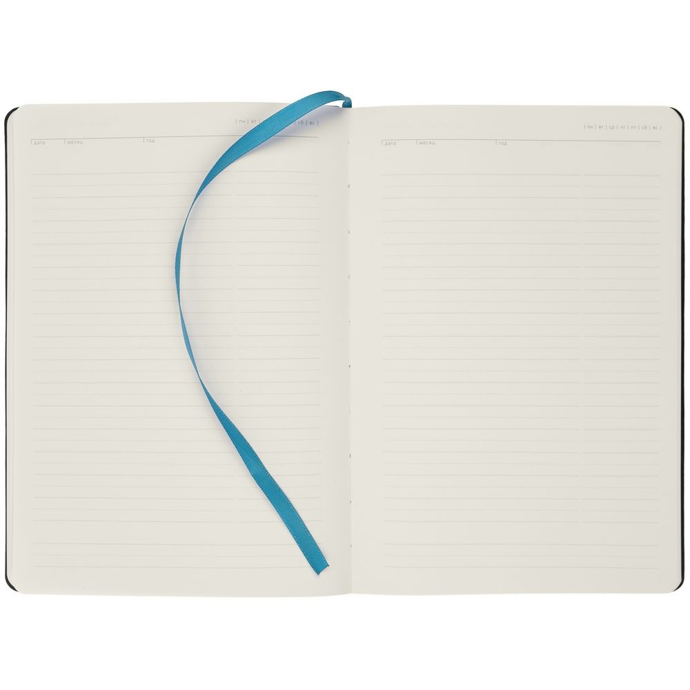 Расчет нанесенияЕжедневник с гибкой обложкой, выполнен из материала Latte, голубой, дополнен ляссе в цвет обложки.