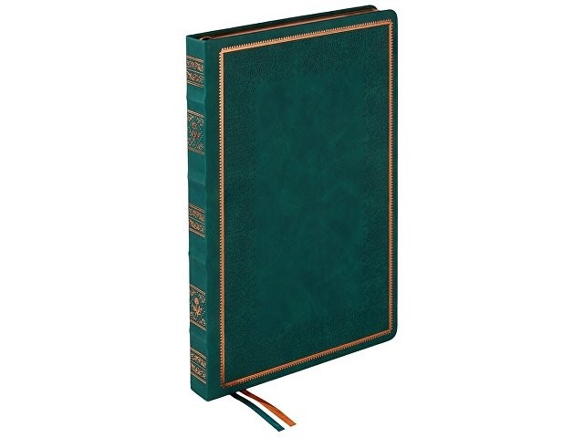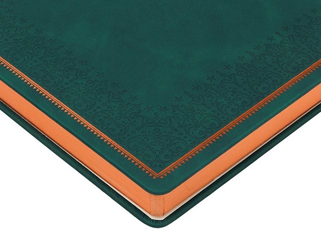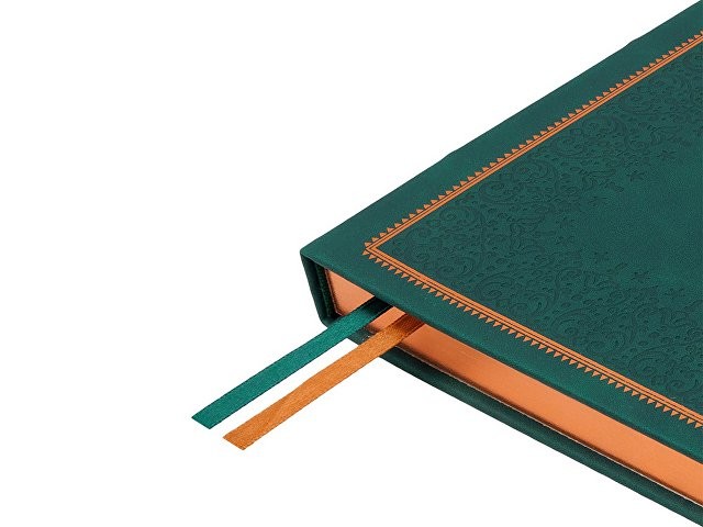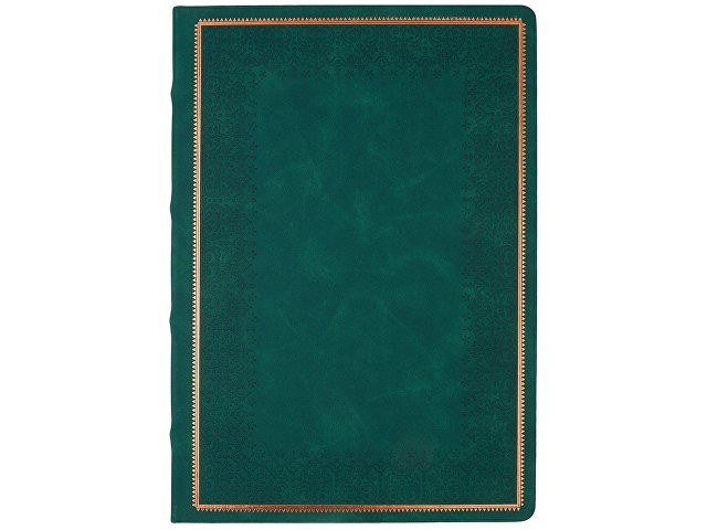 Недатированный ежедневник "Royal" формата А4 с твердой обложкой из искусственной кожи с имитацией нубука украшен художественным бронзовым и блинтовым тиснением. Внутри 192 страницы, выполненные из качественной бежевой бумаги в линейку плотностью 140 г/м². Два шелковых ляссе в цвет обреза блока и обложки облегчают навигацию по записям. Французский корешок дополнительно декорирован изящным бронзовым тиснением в виде виньеток. Скругленные углы обложки и блока подчеркивают стильный дизайн изделия, а блеск бронзового обреза дарит ежедневнику благородный и роскошный внешний вид.