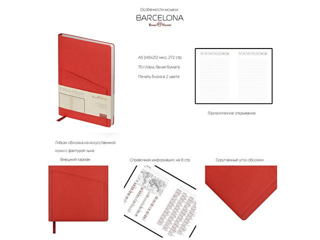 Это ежедневник предназначен для тех, кто отдает предпочтение строгости. Телефон, ручка, визитки и листы для записей будут всегда под рукой благодаря удобному карману на фронтальной стороне. В недатированном ежедневнике Barcelona красного цвета используется белая бумага плотность 70 г/м. Ляссе благородного бордового цвета сочетается с обложкой. Скругленный угол - фирменная особенность ежедневников Bruno Visconti. Справочная информация на 8 страницах. Ежедневник Barcelona упаковывается в картонный полукороб и термопленку.