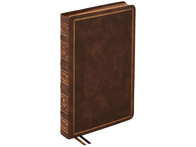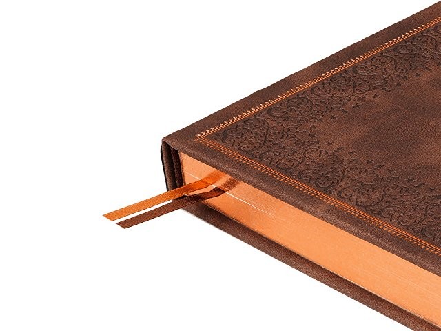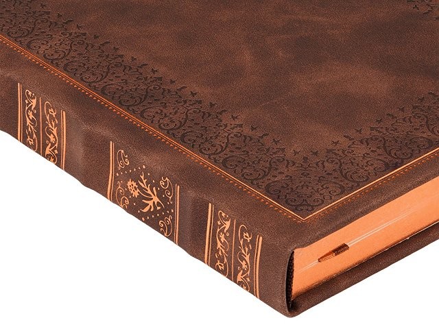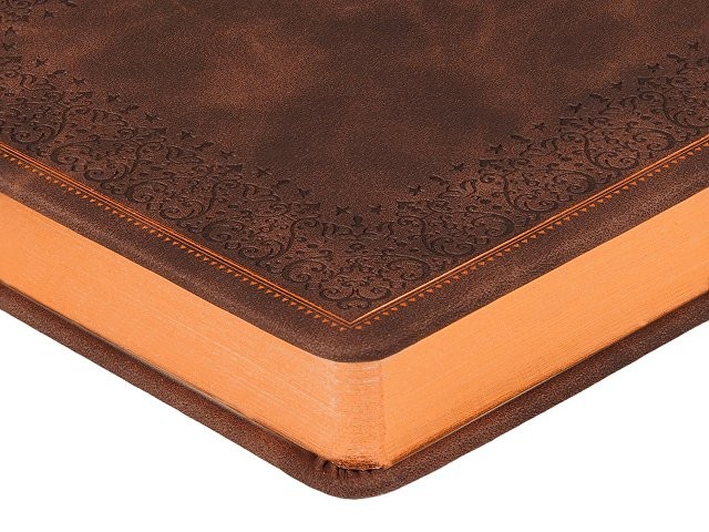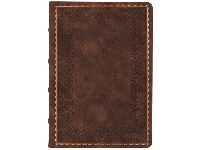 Недатированный ежедневник "Royal" формата А5 с твердой обложкой из искусственной кожи с имитацией нубука украшен художественным бронзовым и блинтовым тиснением. Внутри 256 страниц, выполненных из качественной бежевой бумаги в линейку плотностью 100 г/м². Два шелковых ляссе в цвет обреза блока и обложки облегчают навигацию по записям. Французский корешок дополнительно декорирован изящным бронзовым тиснением в виде виньеток. Скругленные углы обложки и блока подчеркивают стильный дизайн изделия, а блеск бронзового обреза дарит ежедневнику благородный и роскошный внешний вид.