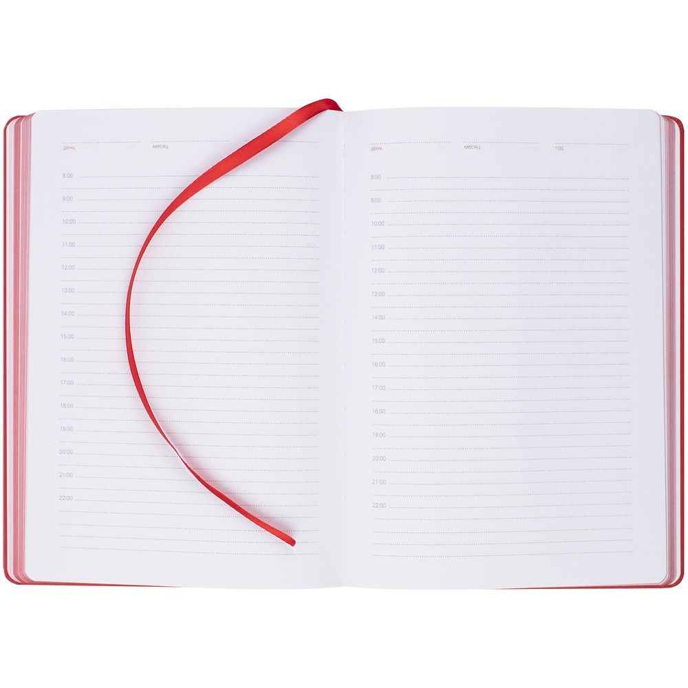 Ежедневник с твердой обложкой, выполнен из материала Latte, красный РР, обрез красного цвета, дополнен ляссе красного цвета ирезинкой с металлическим шильдом.