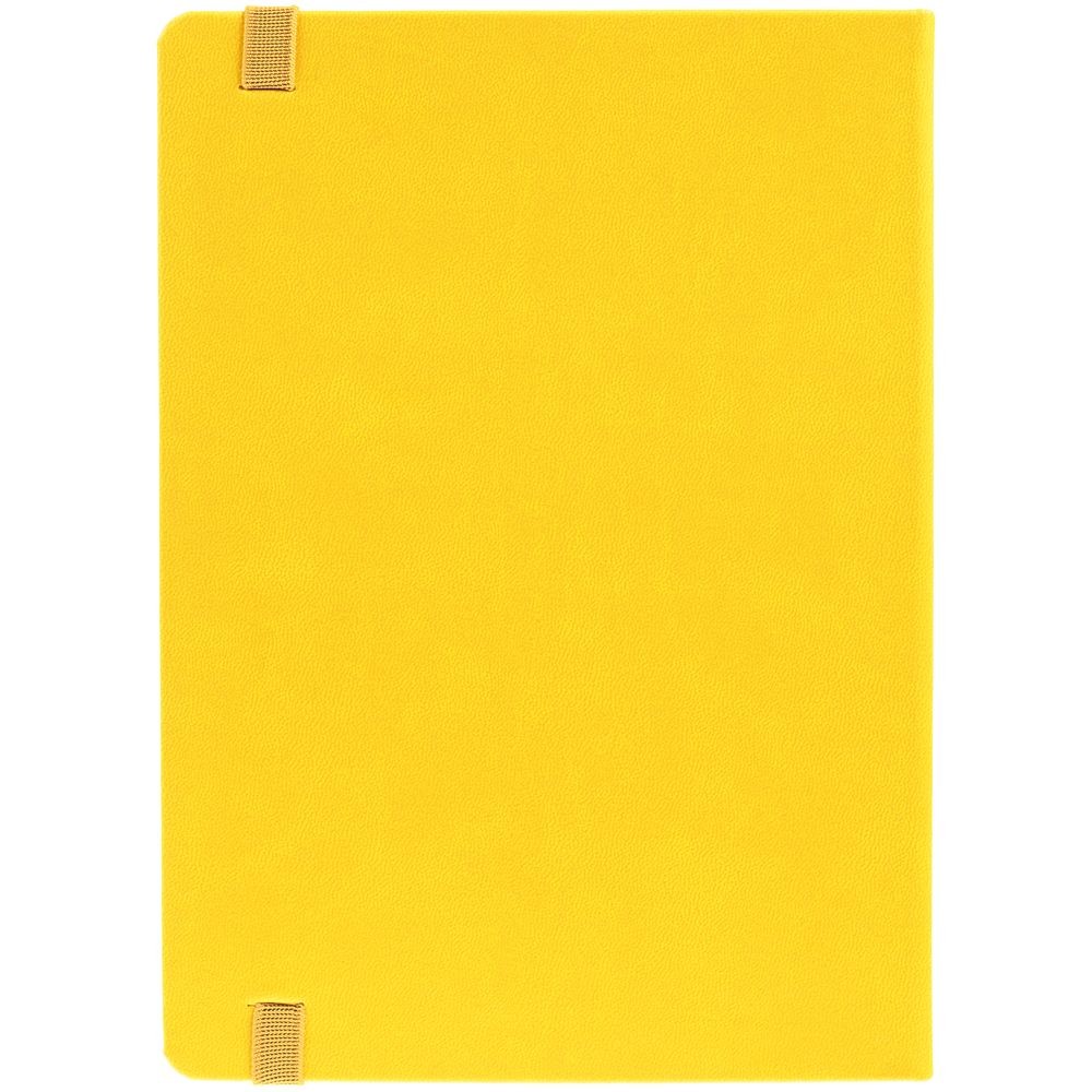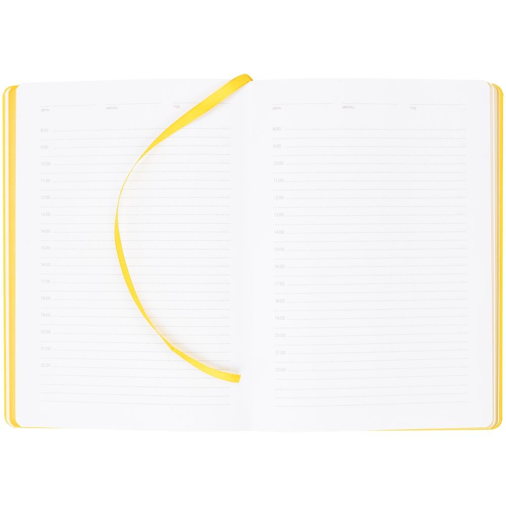 Ежедневник с твердой обложкой, выполнен из материала Latte, желтый КК, обрез зеленого цвета, дополнен ляссе желтого цвета и резинкой с металлическим шильдом.
