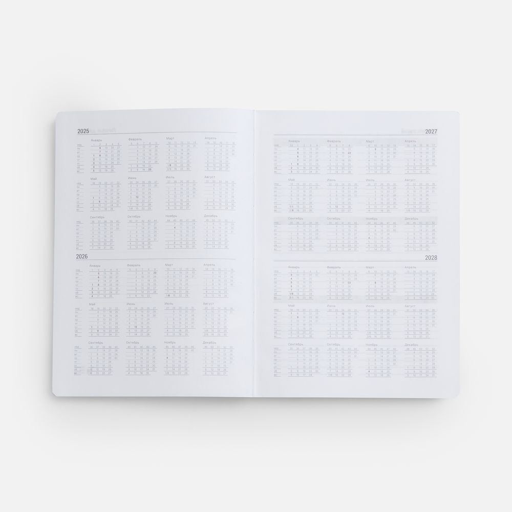 Ежедневник с твердой обложкой, выполнен из материала Latte, темно-синий ХХ, обрез темно-синего цвета, дополнен резинкой и ляссе темно-синего цвета.