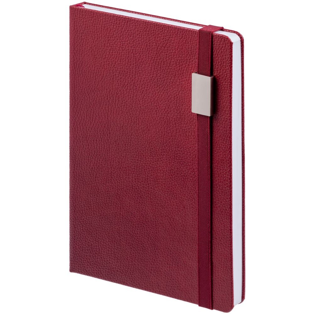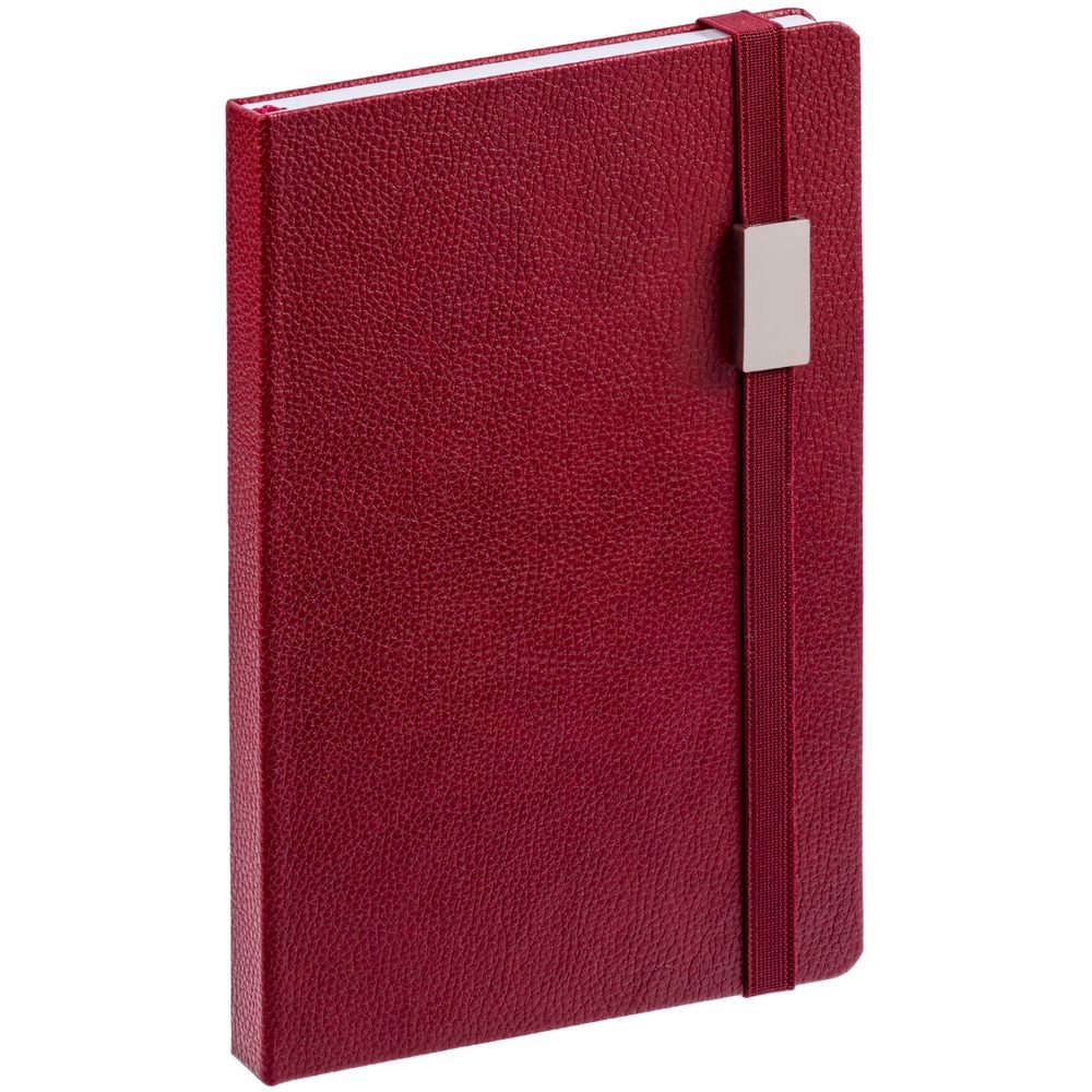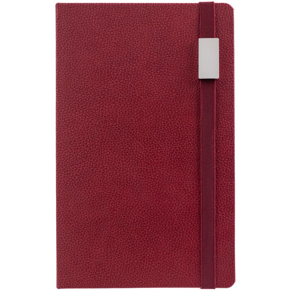 Ежедневник с твердой обложкой, выполнен из материала LaFite, красный РР, дополнен резинкой с металлическим прямоугольным шильдом и ляссе в цвет обложки.