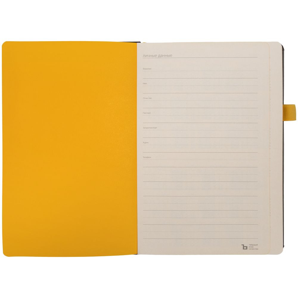 Ежедневник с твердой обложкой, выполнен из материала Waltz, черный АА, дополнен желтой резинкой и ляссе.