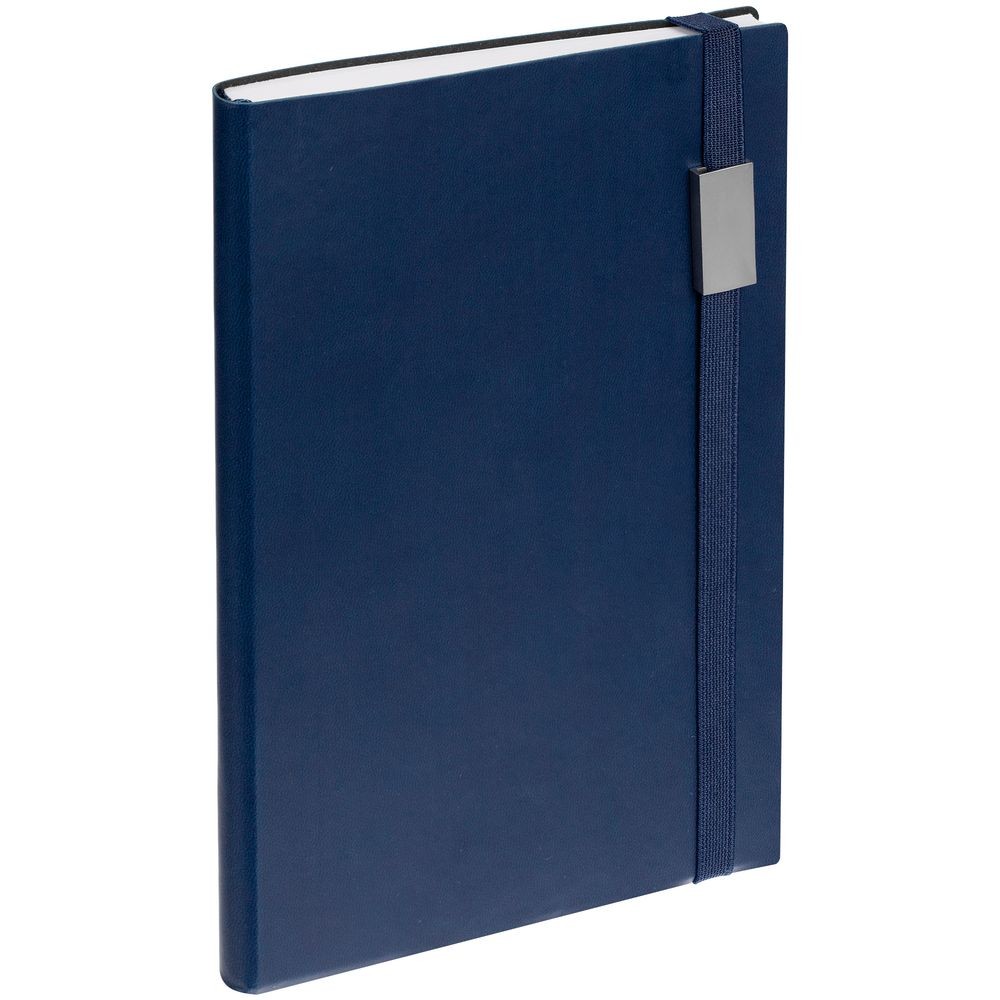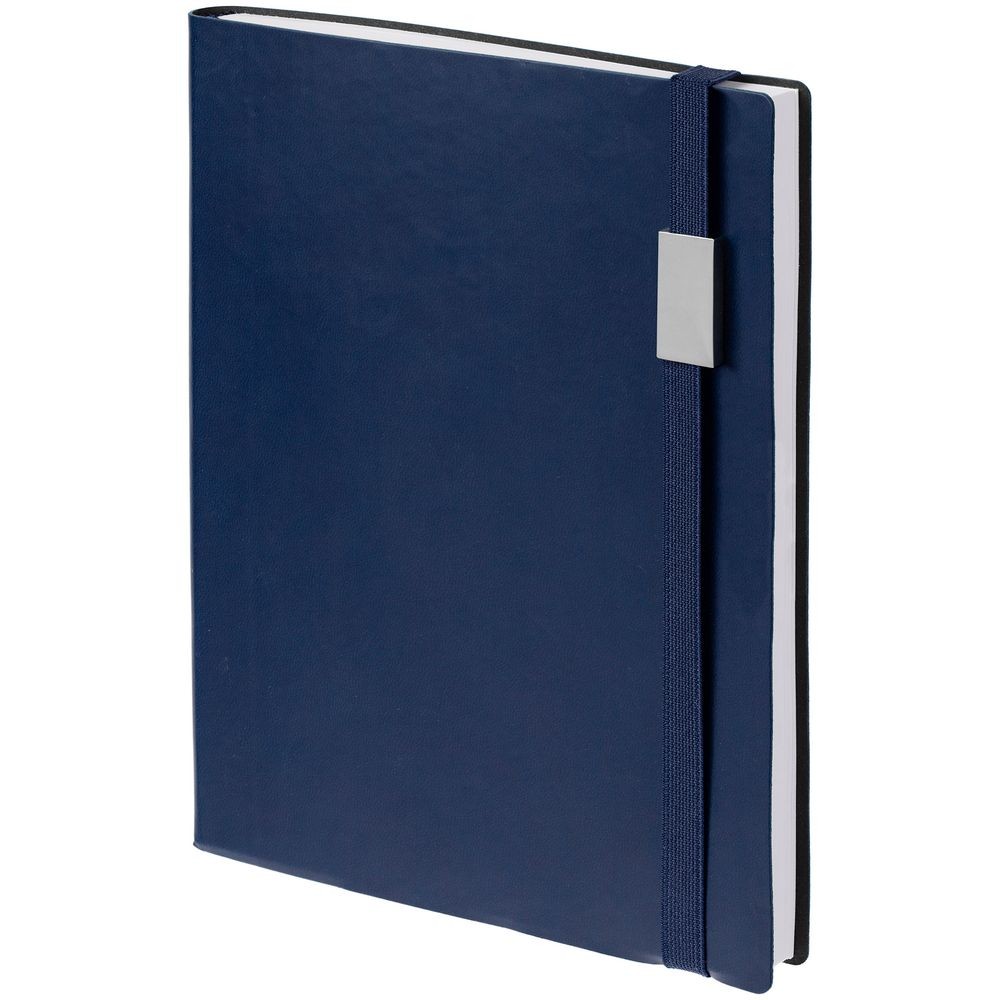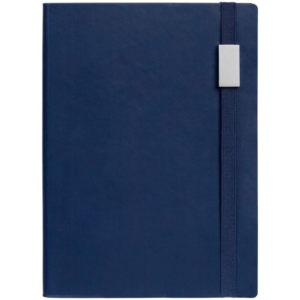 Ежедневник с гибкой обложкой, выполнен из материала Latte, темно-синий XX, дополнен резинкой шириной 1 см, капталом и ляссе синего цвета.