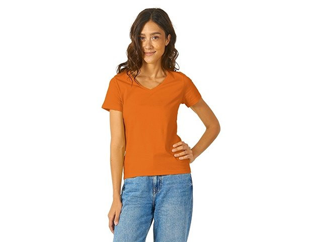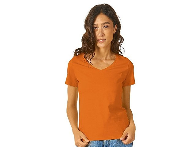 Женская футболка из натурального хлопка с элегантным V-образным вырезом. Материал отлично подходит для нанесения рекламной информации. Натуральная ткань не вызывает раздражения кожи.