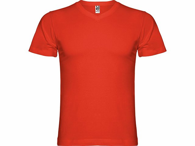 Мужская футболка без боковых швов с коротким рукавом и V-образным вырезом горловины, отделанном рибом 1х1. Горловина и плечевые швы дополнительно укреплены тесьмой.