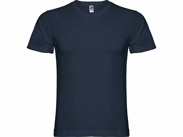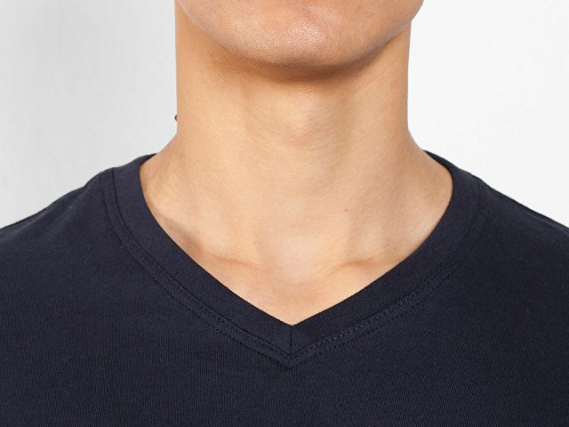 Мужская футболка без боковых швов с коротким рукавом и V-образным вырезом горловины, отделанном рибом 1х1. Горловина и плечевые швы дополнительно укреплены тесьмой.