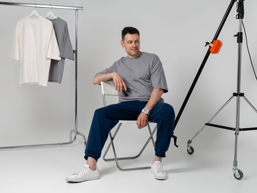 Футболка унисекс свободного кроя со спущенным плечом и смещенными плечевыми швами.