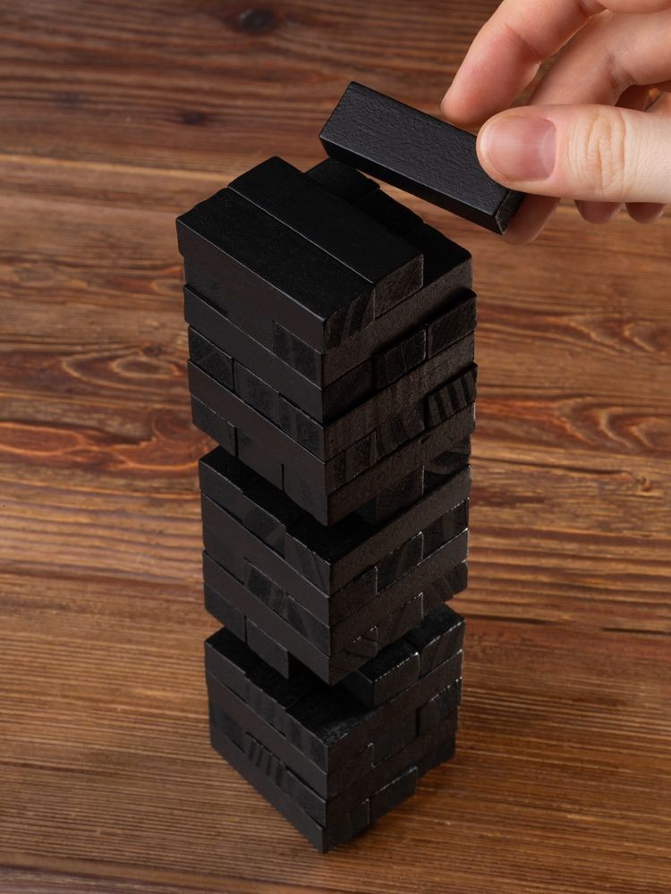 Второе название игры — «Падающая башня». Сначала строится башня: по три брусочка в ряд, каждый слой перпендикулярен предыдущему. Затем игроки по очереди вытаскивают по одному брусочку и кладут его на верх сооружения. Тот игрок, кто обрушит башню, проиграл. Игра тренирует ловкость, внимание, терпение и пространственное мышление, что очень важно и в бизнесе. Так что подарок не только развлечет, но и может стать символом-пожеланием.