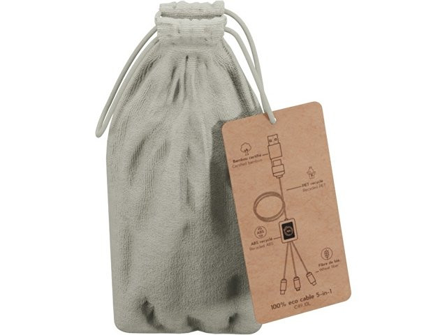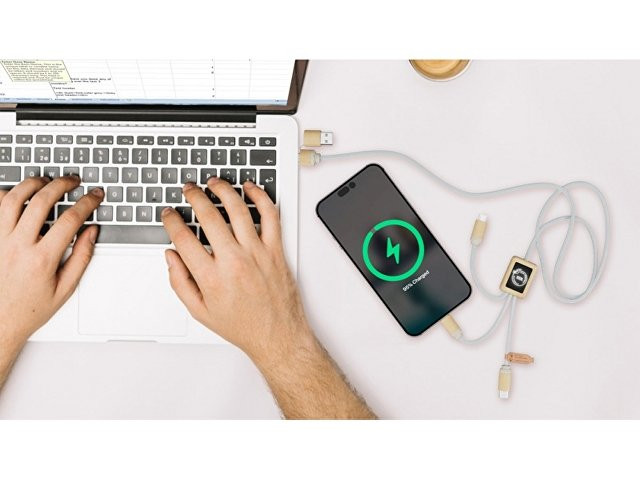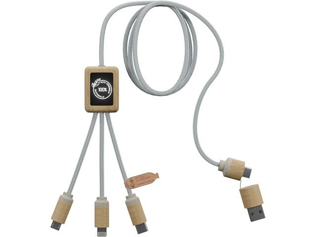 Кабель для быстрой зарядки на 2,4 А (3 x 10 см), обе стороны которого можно персонализировать разными светящимися логотипами. Кабель полностью изготовлен из более экологичных материалов: переработанных ПЭТ-кабелей, бамбука, пшеничных волокон и переработанной пластмассы. Зарядный кабель универсален благодаря 3 выходам (Type-C, Android, iPhone) и может заряжать до трех устройств одновременно. Благодаря двойному входу USB и USB-C кабель совместим с новейшими зарядными устройствами. Поставляется в хлопковой сумке (20 x 8 см) с карточкой из крафт-бумаги. Переработанный PET пластик, Бамбуковое дерево.