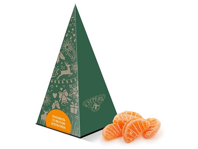 Картонная ёлка с выборочным УФ-лаком с натуральными леденцами со вкусом апельсина. Прекрасное дополнение к любому подарку на Новый Год и Рождество. Яркая праздничная упаковка и интересное наполнение. Состав: Патока, вода, регуляторы кислотности (лимонная кислота, молочная кислота), ароматизаторы, идентичные натуральным, краситель: аннато, сахар.