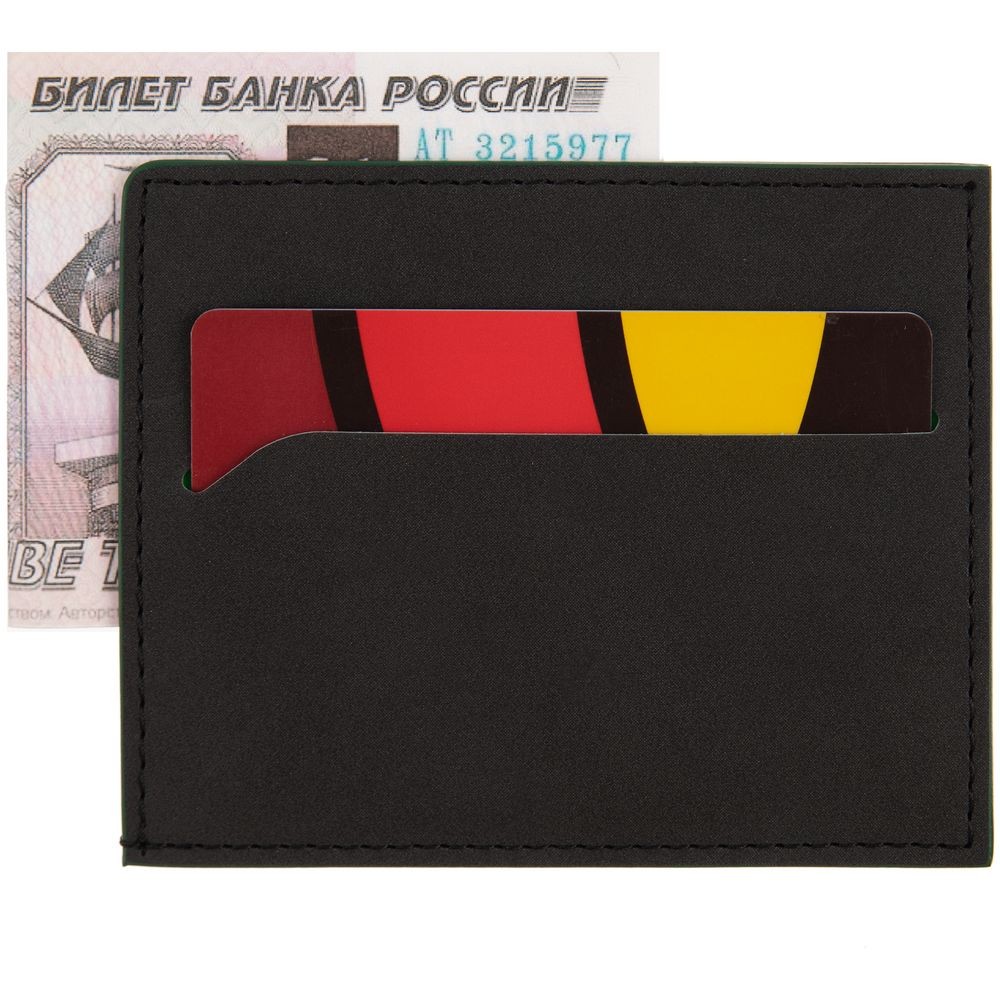 Чехол выполнен из материала Soft Touch Pearl, черный АА, дополнен окрашенным срезом края и внутренним карманом из цветного картона. Имеет 4 отделения для кредитных карт и 1 отделение для купюр.