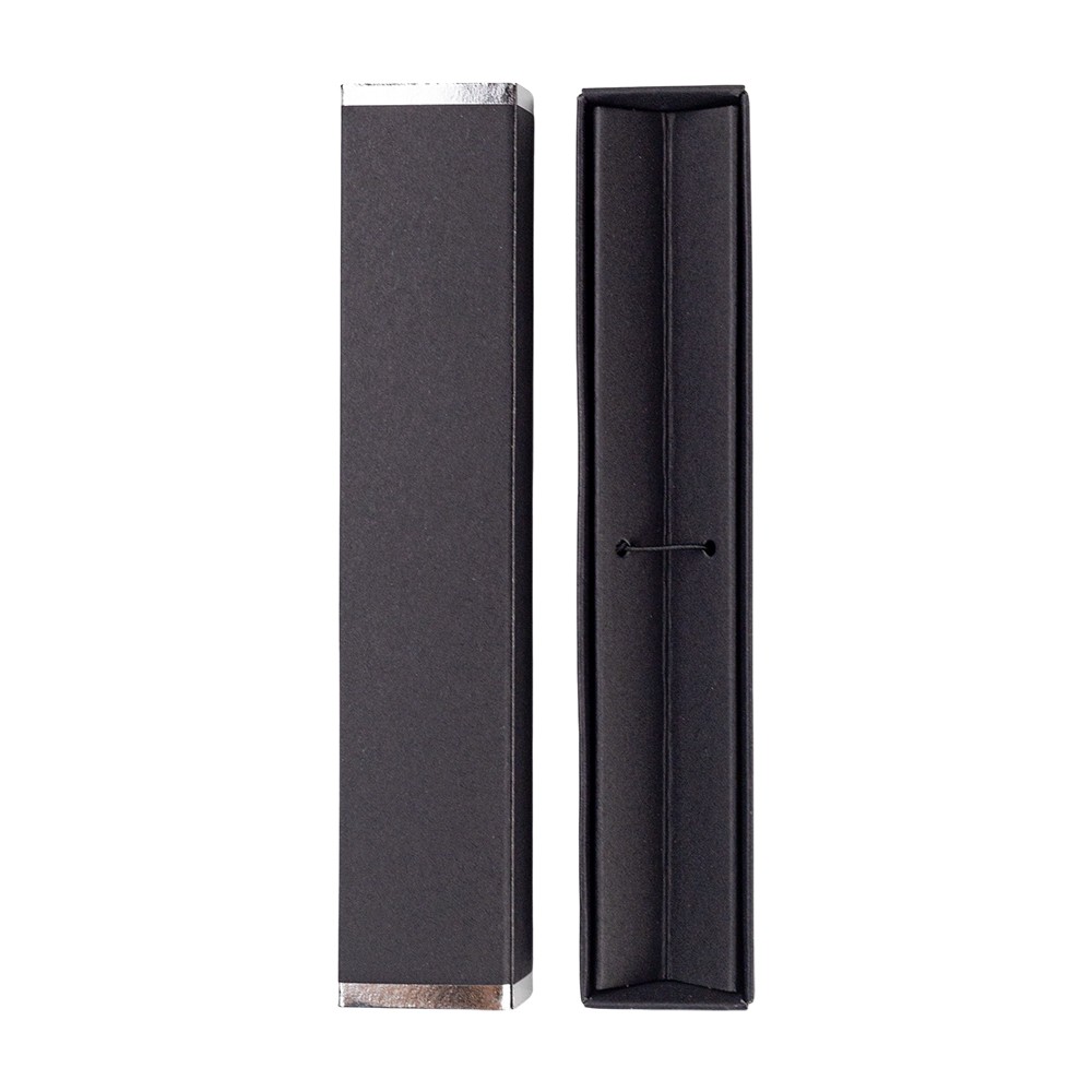 Бумажная коробочка для ручки. Ложемент V-образный с резинкой, фиксирующей ручку. По краям крышки металлизированные декоративные элементы, для красоты. В такой коробочке подаренная ручка будет выглядеть ещё дороже, словно фотомодель в вечернем платье.