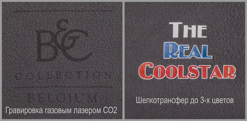 Возможно нанесение методом лазерной гравировки (газовый лазер СО2, код нанесения L1): детальная проработка мелких элементов и тонких линий с высоким контрастом изображения (рекомендуется на флисах темно-красного и стального серого цветов).