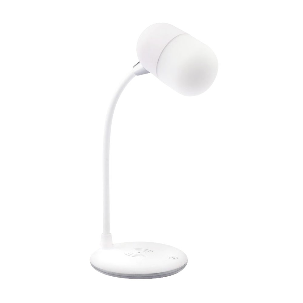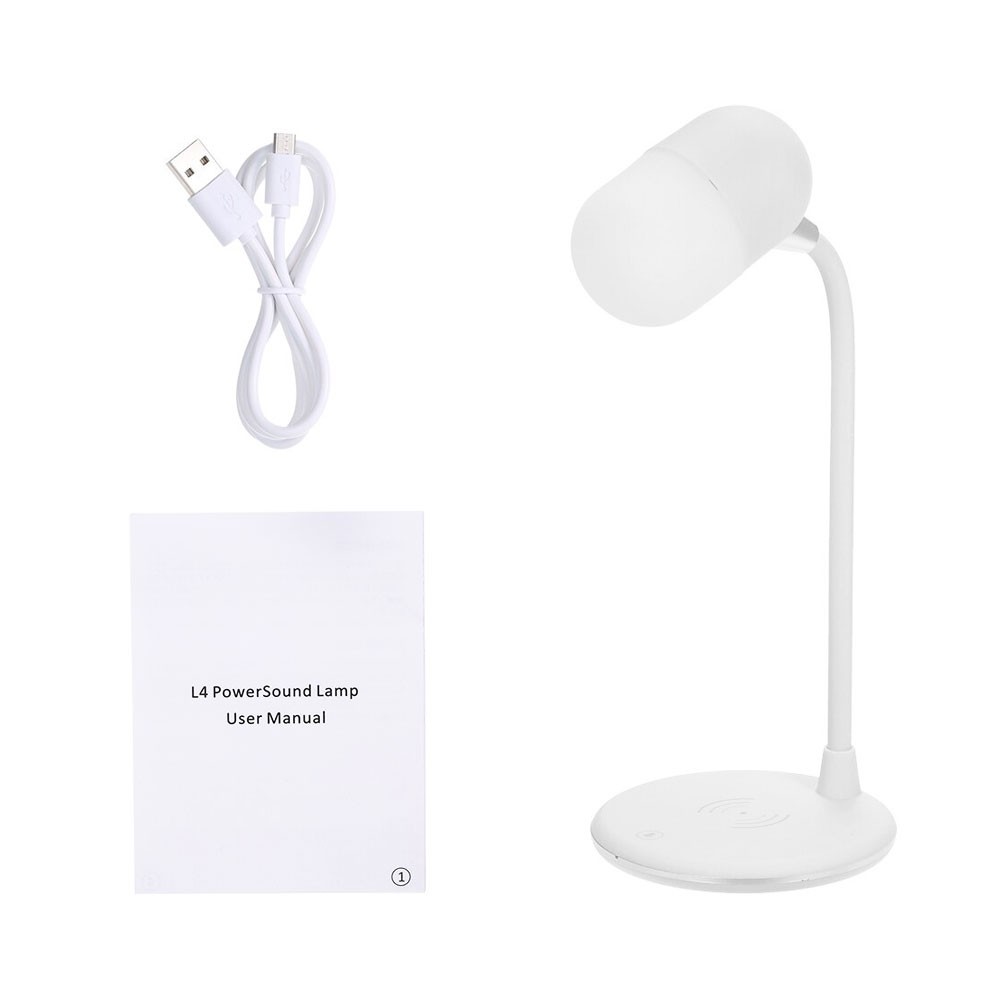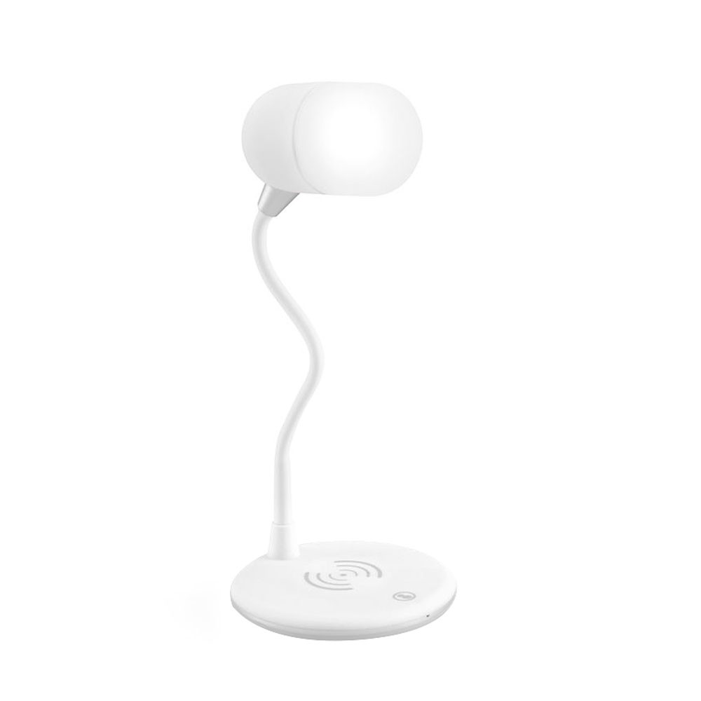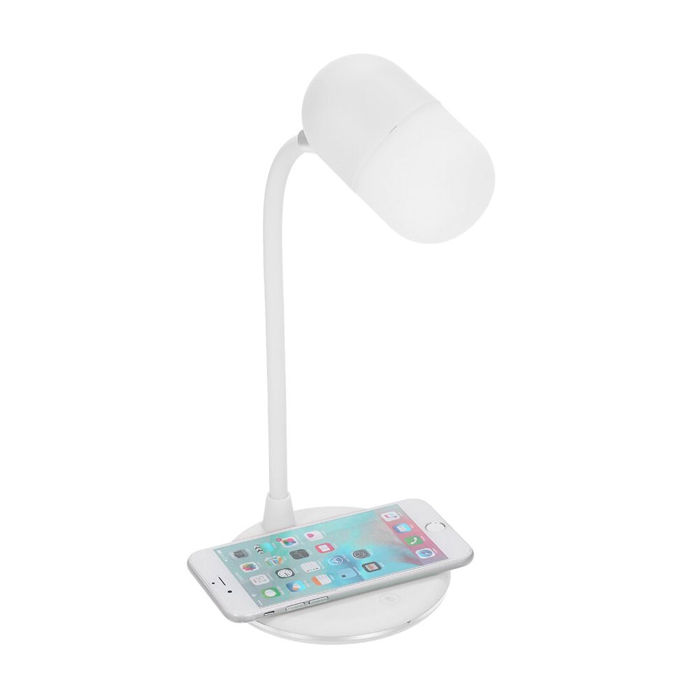 Настольная лампа с колонкой и беспроводной зарядкой Alladin. Тип светодиодного индикатора: cветодиодная панель (яркость 28LM±2), три режима настройки света (яркий, теплый, холодный), 7 светодиодов. Мощность беспроводной зарядки: 5 Вт. Максимальная мощность беспроводного зарядного устройства: 5/10 Вт (опционально). Мощность динамика: 3 Вт. Вход:5V/3A. Версия Bluetooth: V5.0. В комплекте кабель USB и инструкция. Область зарядки смартфона поддерживает все Android/Ios устройства с функцией беспроводной зарядки. Для работы беспроводной зарядки необходимо подключать устройство к сети через адаптер.