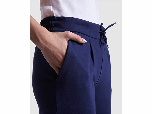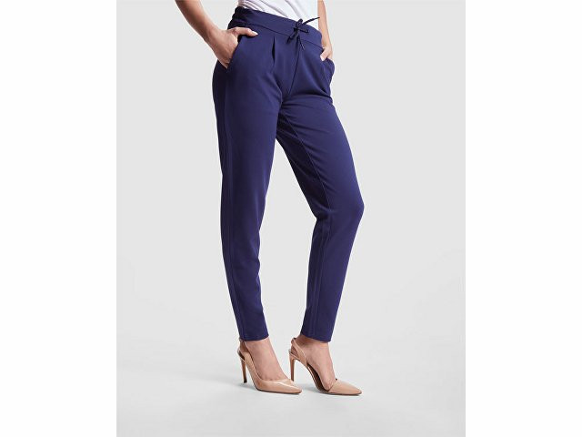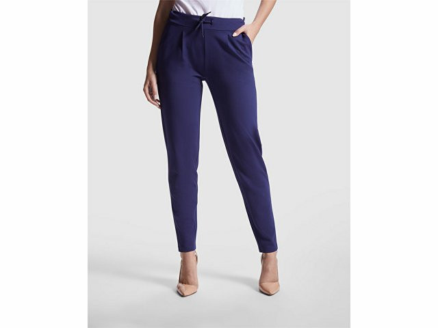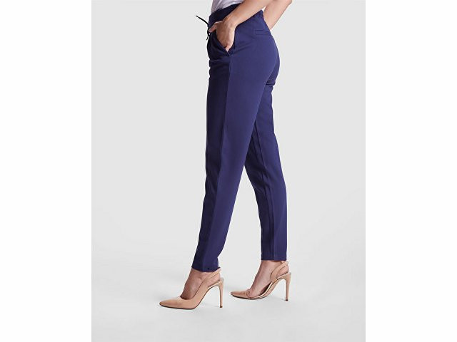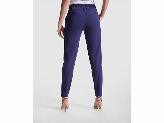 Женские брюки из эластичной ткани. · Эластичный пояс на кулиске сзади. · Складки спереди. · Два передних кармана. · Два задних кармана на пуговицах.