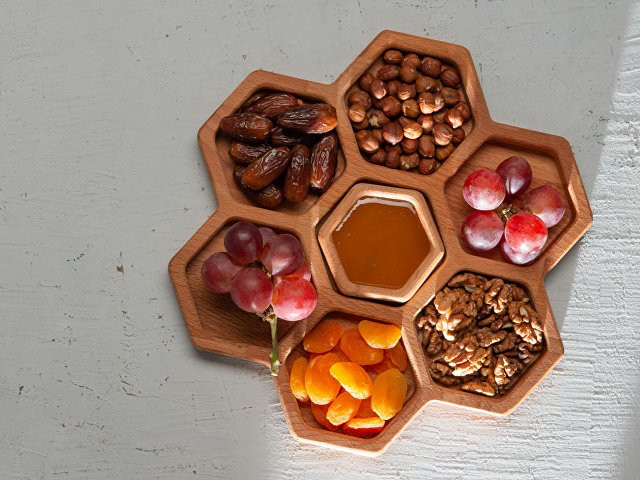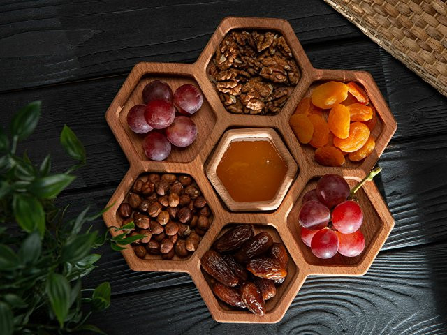 Менажница выполнена в виде семи сот для разных видов закусок — за бонусную дополнительную отвечает съемная сота-соусница, в которую можно залить мед или любимый соус. Менажница выполнена из бука и пропитана маслом, что обеспечивает изделию свежий вид. Советуем регулярно смазывать дерево пищевым маслом, чтобы изделие дольше радовало вас. - натуральный бук - съемная соусница - интересный дизайн - вариант для подачи 8 видов закусок - можно использовать для сервировки закусок