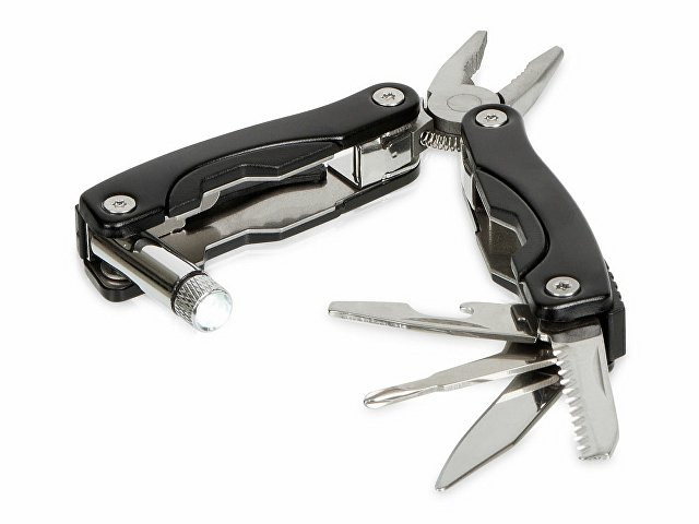 Мультиинструмент с диодным фонариком. В комплекте нейлоновый чехол с петелькой для крепления и застежкой на липучке. Батарейки в комплекте. - плоскогубцы - фонарик - пила - нож универсальный - плоская отвертка - крестовая отвертка - открывашка для банок/бутылок