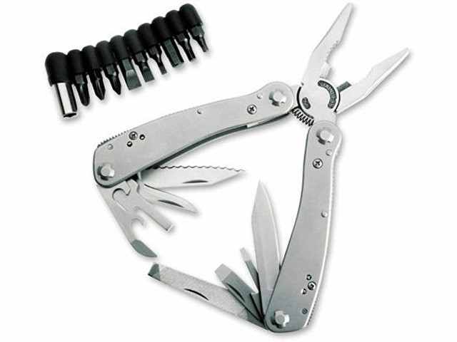 МНОГОФУНКЦИОНАЛЬНЫЙ ИНСТРУМЕНТ STINGER С НАБОРОМ ИЗ 10 ФУНКЦИЙ: 1. Плоскогубцы 2. Напильник по дереву и металлу 3. Отвёртка плоская 6 мм 4. Отвёртка плоская 3 мм 5. Открывалка для бутылок и консерв 6. Пила 7. Лезвие большое плоское 8. Лезвие малое с волнистой кромкой 9. Шило 10. Набор из 10 бит ХАРАКТЕРИСТИКИ: Материал инструментов: нержавеющая сталь Материал рукояти: алюминий Длина: 105 мм Ширина: 50 мм Вес: 383 г В комплекте: чехол из синтетического материала Упаковка: складная картонная коробка
