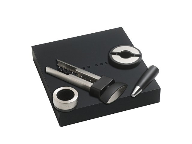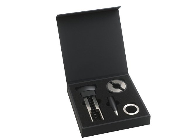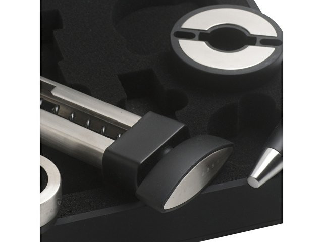 Набор для вина от Hugo Boss состоит из каплеуловителя, штопора, пробки для бутылки и ножа для фольги. Все элементы набора выполнены в стальном с черными вставками цвете и имеют вставки из силиконовой резины. Матовая текстура черных вставок кажется еще более бархатистой, оттеняемая серебристой нержавеющей сталью, из которой выполнены металлические детали элементов набора. Каждое приспособление для вина имеет логотип Hugo Boss: на пробке и ноже для фольги лого нанесено на черные вставки, а у штопора и каплеуловителя маркированы металлические детали. Набор поставляется в фирменной подарочной черной коробке на магнитном клапане и с ложементом, на котором под каждое приспособление вырублена ниша. Сертификат подлинности приложен к каждому комплекту.