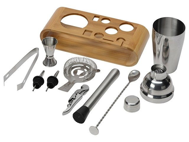 Роскошный подарок для всех, кто любит самостоятельно миксовать коктейли и устраивать незабываемые вечеринки! В наборе Bartender есть абсолютно все, что необходимо для приготовления любых коктейлей: - бамбуковая подставка, - барная ложка, - джиггер 15/30 мл, - гейзер (2 шт.) или дозатор для бутылок, - мадлер или пестик - толкушка для выдавливания сока из фруктов и ягод, - штопор, - стрейнер или ситечко/фильтр, - щипцы для льда, - шейкер 550 мл.