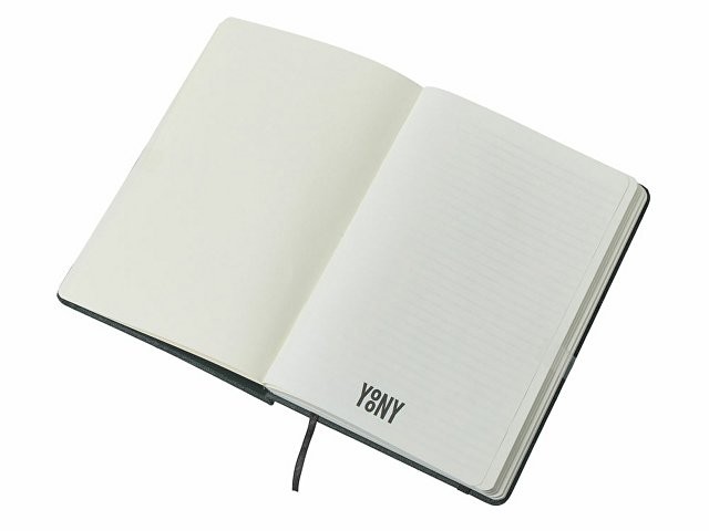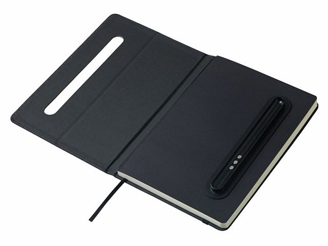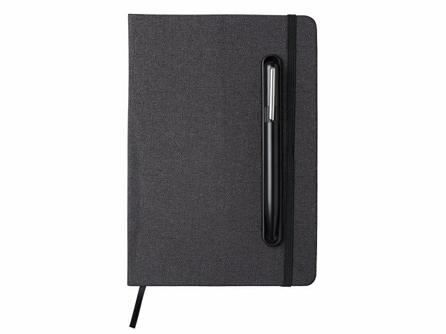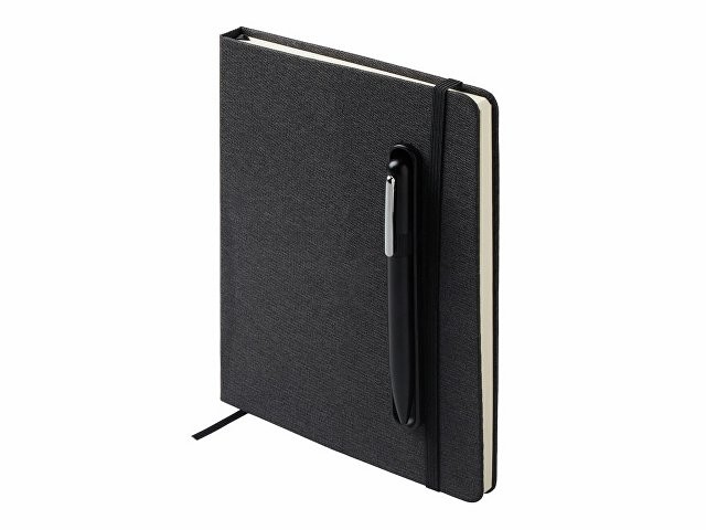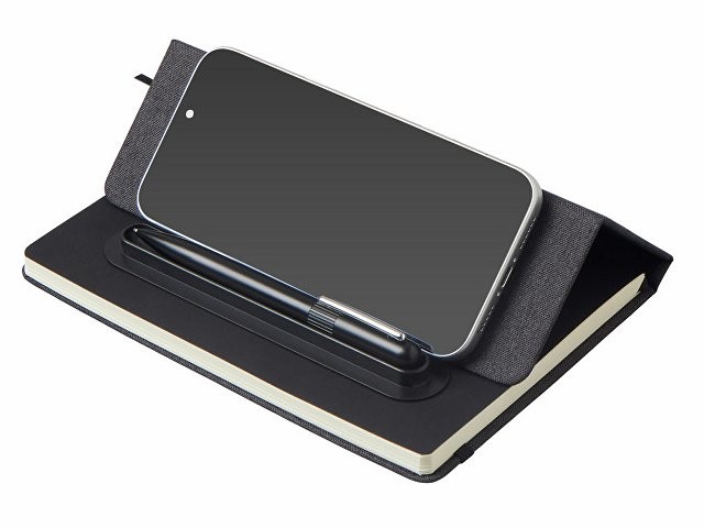 Блокнот в твердой обложке из rpet-пластика с металлической шариковой ручкой. В обложке магнитный держатель для ручки. Также верхняя часть обложки трансформируется в подставку для телефона. В блокноте 80 листов бумаги 70 г/м2.