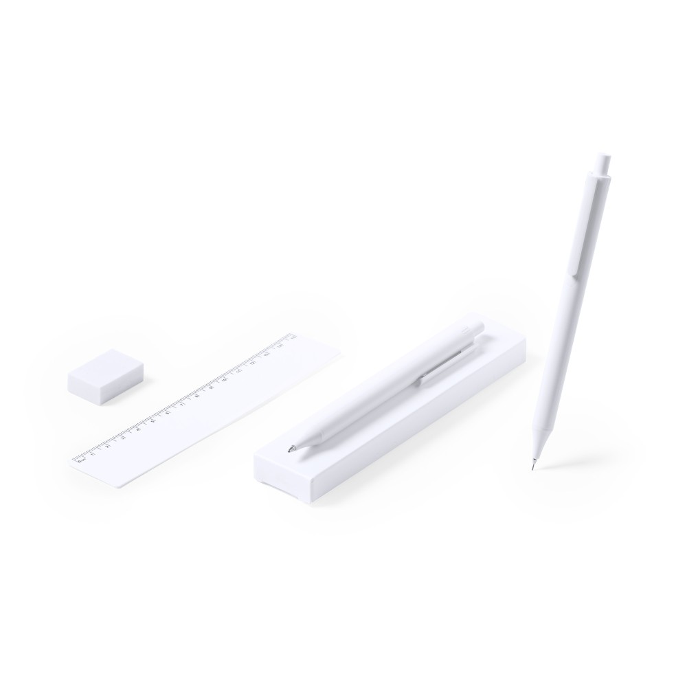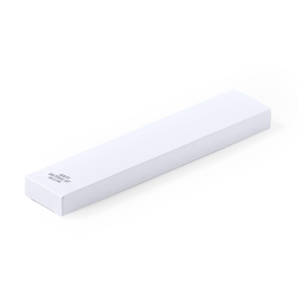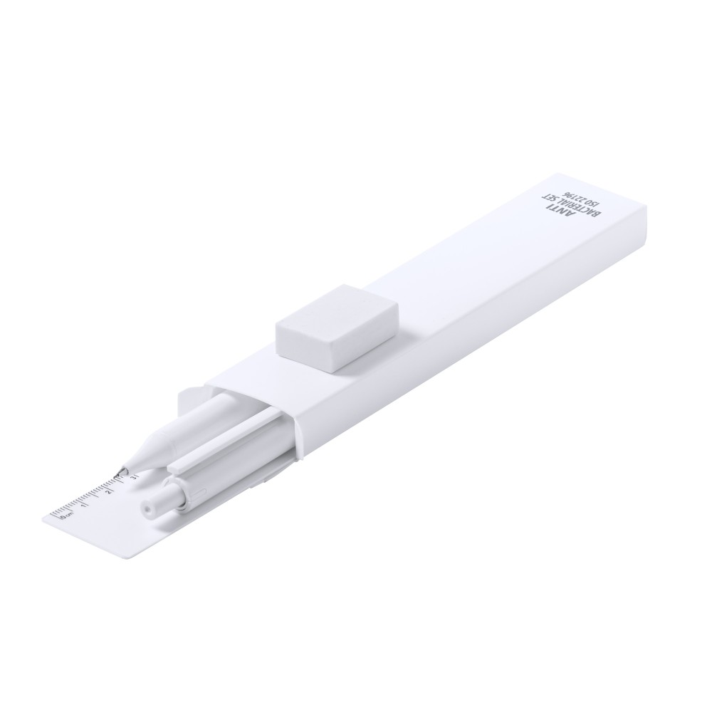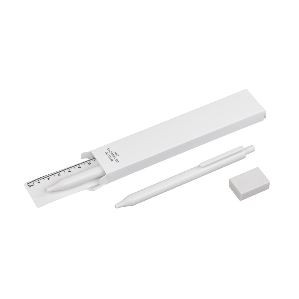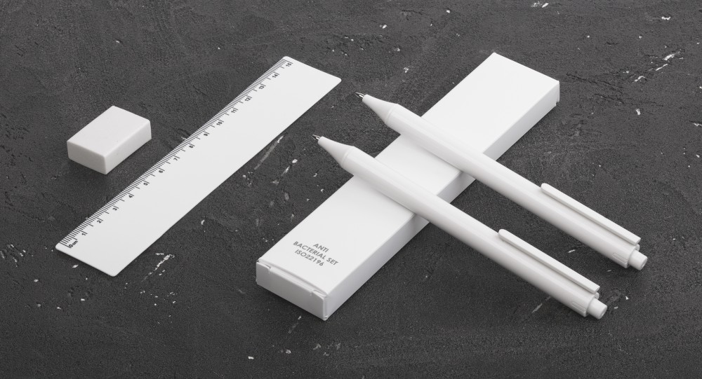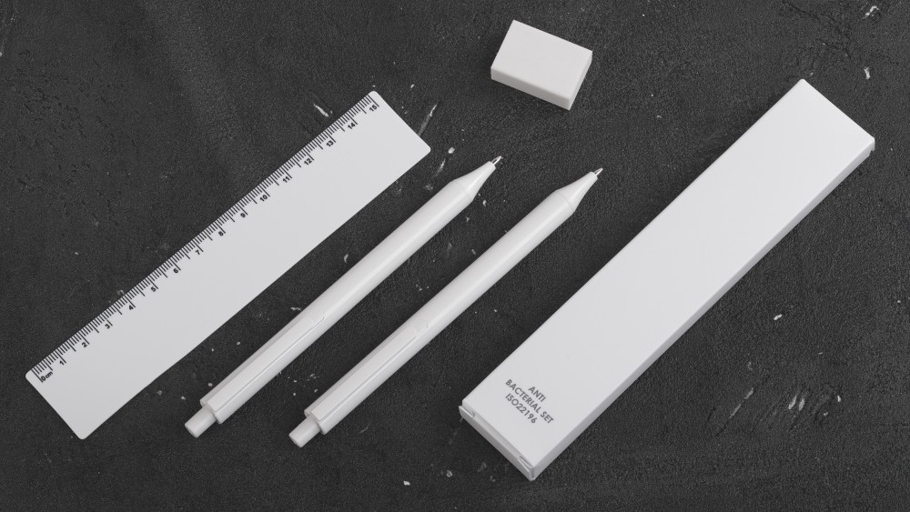 Антибактериальный набор включает ручку, механический карандаш (грифель 0,5 мм в комплекте), линейку на 15 см и ластик. Благодаря добавлению высокоэффективных противомикробных агентов достигается резкое снижение уровня бактерий, присутствующих на поверхностях материалов. Изделие соответствует стандарту ISO 22196, который определяет антибактериальную активность пластмасс и непористых поверхностей.