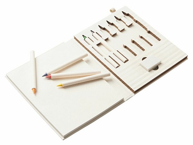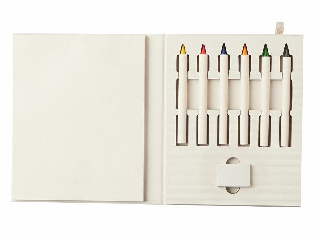 Набор для рисования из переработанных тетра-паков. Внутри 6 цветных карандашей, ластик и пустые листы для рисования.