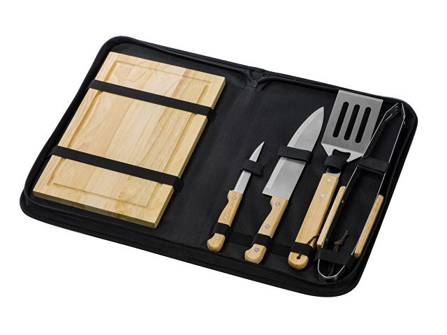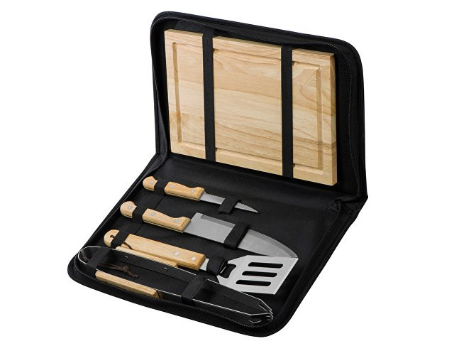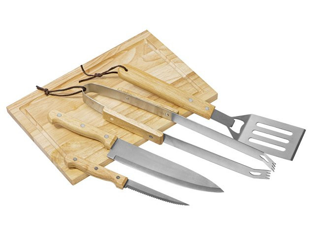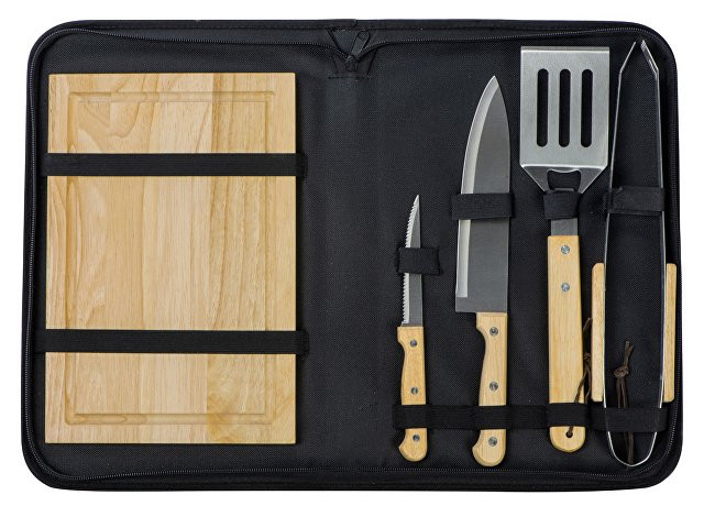 Набор из шести приспособлений для барбекю и гриля - в состав входят разделочная доска, щипцы, лопатка, нож для стейка, нож большой, а упаковывается сет в чехол из полиэстера. Благодаря длинным ручкам из каучукового дерева лопатку, ножи и щипцы удобно держать, не боясь горячих брызг при готовке. Деревянные ручки не нагреваются, что особенно ценно во время BBQ. - приспособления для всех этапов приготовления барбекю и гриля - деревянные длинные ручки не нагреваются и не скользят - нержавеющая сталь, каучуковое дерево - чехол для хранения из полиэстера