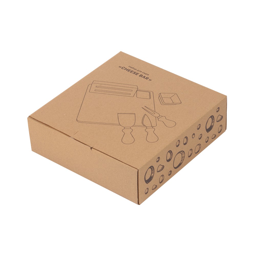 доска: 21,1 х 6,3 х 20 см соусник: 6,7 х 3,6 x 6,7 см, 100 мл листовидный нож 12 х d 2,9 см нож-лопатка 12,4 х d 2,9 см вилка 12,7 х d 2,9 см коробка 22,2 х 6,8 х 21 см