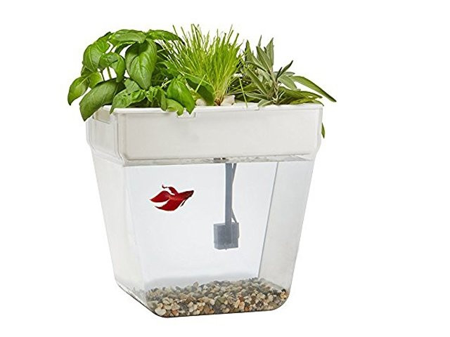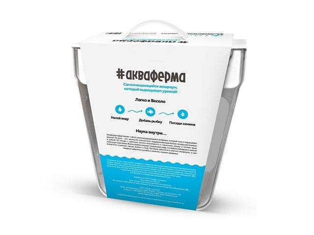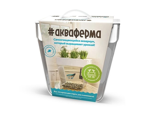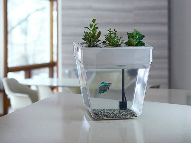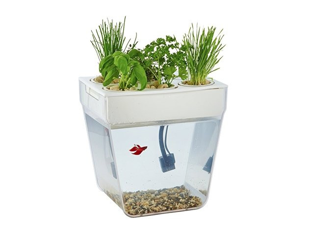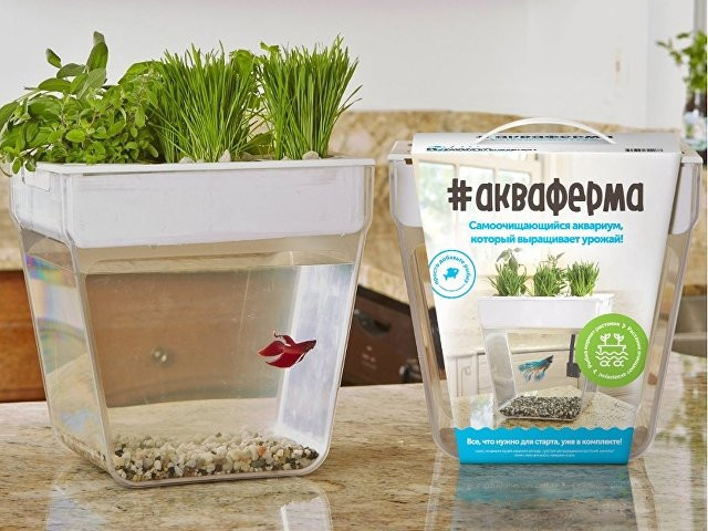 Акваферма представляет собой самоочищающийся аквариум, который ещё и выращивает урожай. По сути — это замкнутая экосистема, поддерживающая баланс между растениями и рыбкой. Её отходы с помощью насоса поднимаются к горшочкам сверху и питают вашу маленькую плантацию. Взамен рыбка получает очищенную воду, а у любого городского жителя всегда есть в наличии свежая зелень к столу. Растения заботятся о чистоте аквариума, а сам аквариум заботится о рыбке и, конечно, о вашем здоровье. Ну а рыбку вам нужно будет выбрать самим и купить ее в ближайшем зоомагазине.