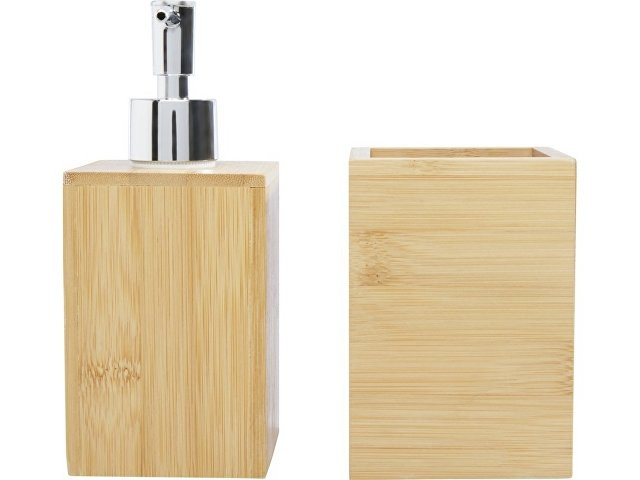 Набор из 3-х аксессуаров из бамбука с современным дизайном для ванной комнаты, состоящий из мыльницы с ситечком (11 x 8,2 x 2,4 см), дозатора для мыла или лосьона (7,1 x 7,2 x 16,8 см) и держателя для зубных щеток (8 x 8 x 11,5 см). Используемый бамбук поставляется и производится в соответствии со стандартами устойчивого развития.