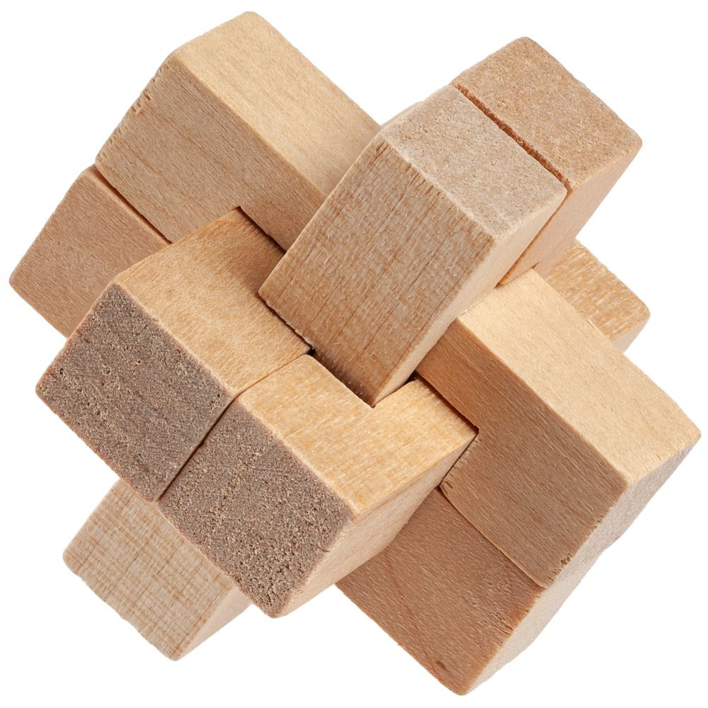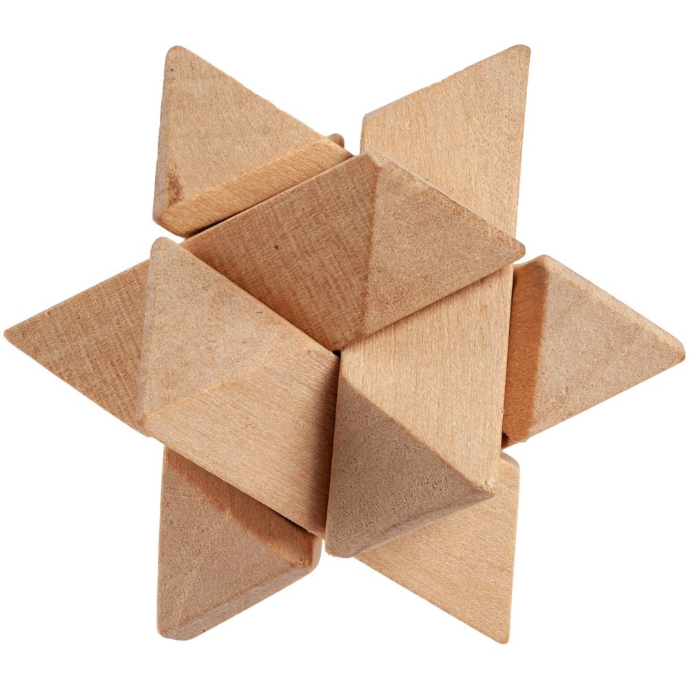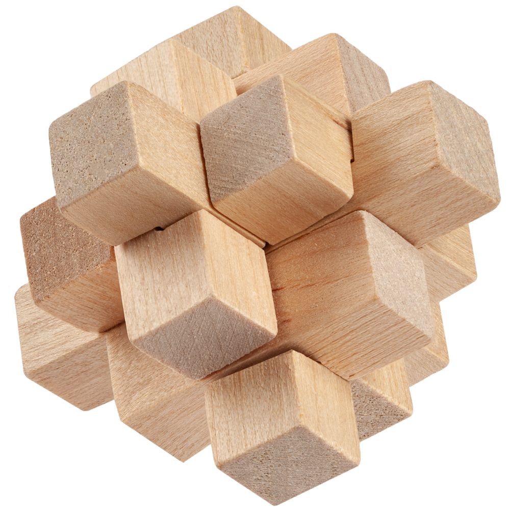 В наборе 3 деревянных головоломки, инструкция, мешочек.