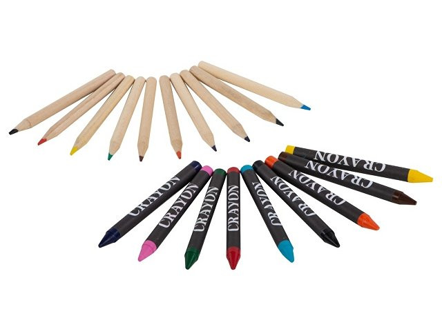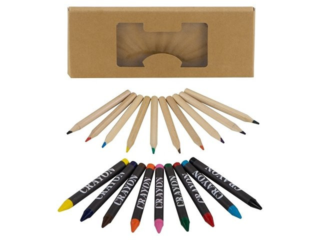 Расчет нанесенияНабор из 19 карандашей. 9 цветных восковых карандашей и 10 цветных карандашей в картонной коробке с пластиковым окошком.