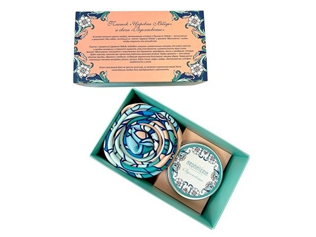Комплект посвящен всем женщинам-музам, окрыляющим на свершения и открытия. Платок «Царевна Лебедь» создан по мотивам сказочно-фольклорного мира А.С. Пушкина, где прекрасная Царевна воплощает добродетель, мудрость и чарующую красоту. Перевоплощаясь в птицу, она способна достичь небывалых высот и озарить мир своим великолепием. Аромат свечи «Вдохновение» соткан из свежих нот цитрусовых и бергамота, пряных аккордов кассии и многоцветия орхидеи, ландыша, ванили. Дуэт станет эффектным акцентом праздничной атмосферы и непременно принесет воодушевляющие мгновения своей обладательнице!