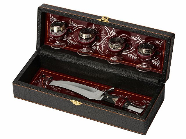 Шкатулка-футляр - хороший подарок, особенно, если в ней достойное содержание. Например, набор рюмок на 4 персоны и нож для закуски. Отдельно такой набор дарить не солидно - не красиво преподносить стопки без упаковки, а пустая шкатулка только разочарует - открывая такую красоту, всегда ждешь внутри что-то чудесное. Подарочную шкатулку приятно поставить в сервант или спрятать в ящик рабочего стола, такой вещью хочется похвалиться друзьям и угостить из нее чем-нибудь вкусненьким, показывая посетителям свой статус и любовь к хорошим вещам. В комплекте: Футляр искусственная кожа -1 шт. Нож «Универсал» (нерж.сталь 40 х13), рукоять орех – 1 шт. Рюмка 30 мл (стекло) – 4 шт.